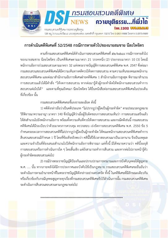 ตามที่กรมสอบสวนคดีพิเศษได้ดำเนินการสอบสวนคดีพิเศษที่ ๕๒/๒๕๔๘ กรณีการหายตัวไปของนายสมชาย นีละไพจิตร เป็นคดีพิเศษตามมาตรา 21 วรรคหนึ่ง (2) ประกอบมาตรา 10 (3) โดยมีพนักงานอัยการร่วมสอบสวนตามมาตรา 32 แห่งพระราชบัญญัติการสอบสวนคดีพิเศษ พ.ศ. 2547 ซึ่งต่อมากรมสอบสวนสอบสวนคดีพิเศษได้มีความเห็นทางคดีควรให้งดการสอบสวน ตามความเห็นของคณะพนักงานสอบสวนคดีพิเศษ และต่อมาสำนักงานอัยการพิเศษฝ่ายคดีพิเศษ 1 สำนักงานอัยการสูงสุด พิจารณาสำนวนการสอบสวนแล้วได้มีคำสั่ง “ให้งดการสอบสวน หากต่อมารู้ตัวผู้กระทำผิดให้พนักงานสอบสวนทำการสอบสวนต่อไปได้” และตามที่คุณอังคณา นีละไพจิตร ได้ยื่นหนังสือต่อกรมสอบสวนคดีพิเศษในประเด็นที่เกี่ยวข้อง นั้น