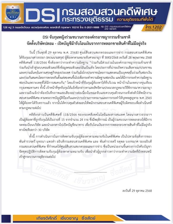 DSI จับกุมหญิงร่วมขบวนการองค์กรอาชญากรรมข้ามชาติ จัดตั้งบริษัทปลอม - เปิดบัญชีม้ารับโอนเงินจากการหลอกขายสินค้าที่ไม่มีอยู่จริง