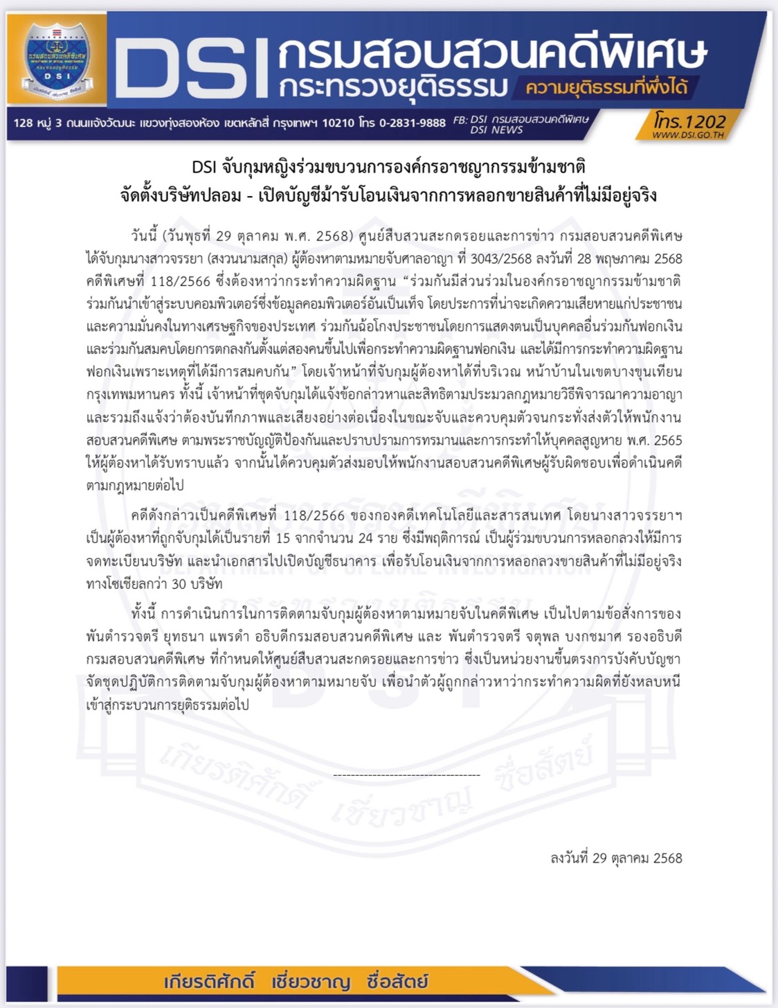 published: 10/29/2025 10:51:10 AM updated: 10/29/2025 10:57:35 AM 40 viewsDSI จับกุมหญิงร่วมขบวนการองค์กรอาชญากรรมข้ามชาติ
