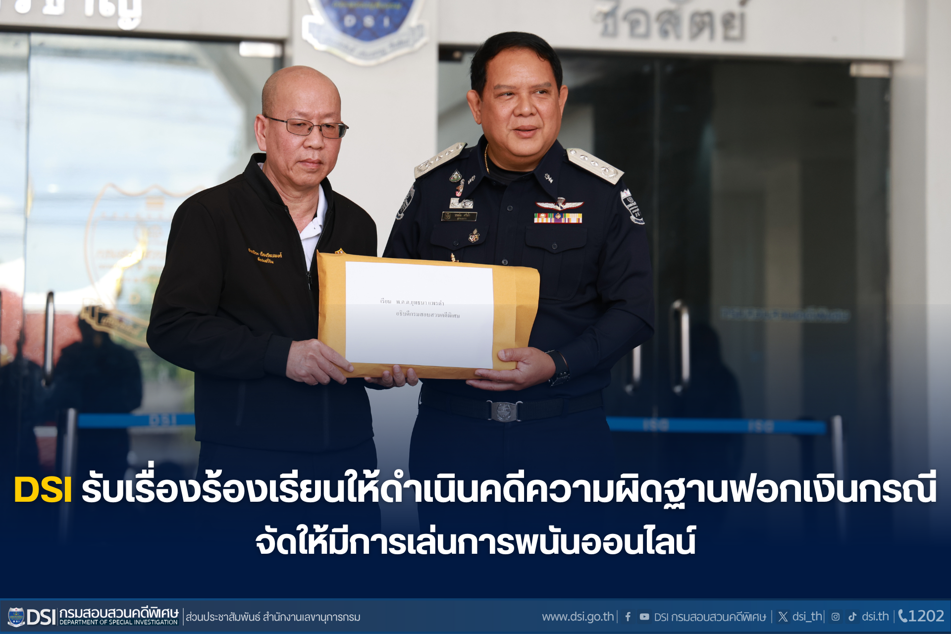 DSI รับเรื่องร้องเรียนให้ดำเนินคดีความผิดฐานฟอกเงินกรณีจัดให้มีการเล่นการพนันออนไลน์