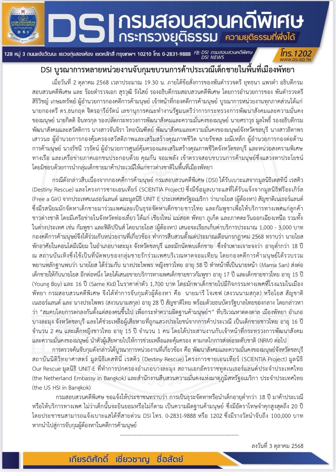กรมสอบสวนคดีพิเศษ ขอแจ้งให้ประชาชนทราบว่า การเป็นธุระจัดหาหรือนำเด็กอายุต่ำกว่า 18 ปี มาค้าประเวณีหรือให้บริการทางเพศ ไม่ว่าเด็กนั้นจะยินยอมหรือไม่ก็ตาม เป็นความผิดฐานค้ามนุษย์ ซึ่งมีอัตราโทษจำคุกสูงสุดถึง 20 ปี โดยประชาชนสามารถแจ้งเบาะแสได้ที่สายด่วน DSI โทร. 0-2831-9888 หรือ 1202 ซึ่งมีรางวัลนำจับถึง 100,000 บาท หากนำไปสู่การจับกุมผู้ต้องหาในคดีการค้ามนุษย์