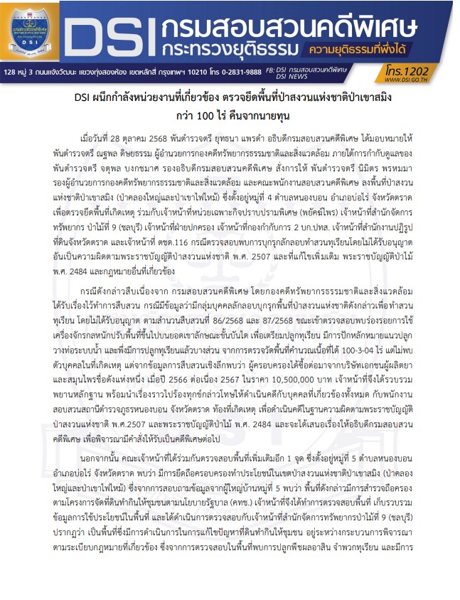 เมื่อวันที่ 28 ตุลาคม 2568 พันตำรวจตรี ยุทธนา แพรดำ อธิบดีกรมสอบสวนคดีพิเศษ ได้มอบหมายให้ พันตำรวจตรี ณฐพล ดิษยธรรม ผู้อำนวยการกองคดีทรัพยากรธรรมชาติและสิ่งแวดล้อม ภายใต้การกำกับดูแลของ พันตำรวจตรี จตุพล บงกชมาศ รองอธิบดีกรมสอบสวนคดีพิเศษ สั่งการให้ พันตำรวจตรี นิมิตร พรหมมา รองผู้อำนวยการกองคดีทรัพยากรธรรมชาติและสิ่งแวดล้อม และคณะพนักงานสอบสวนคดีพิเศษ ลงพื้นที่ป่าสงวนแห่งชาติป่าเขาสมิง (ป่าคลองใหญ่และป่าเขาไฟไหม้) ซึ่งตั้งอยู่หมู่ที่ 4 ตำบลหนองบอน อำเภอบ่อไร่ จังหวัดตราด เพื่อตรวจยึดพื้นที่เกิดเหตุ ร่วมกับเจ้าหน้าที่หน่วยเฉพาะกิจปราบปรามพิเศษ (พยัคฆ์ไพร) เจ้าหน้าที่สำนักจัดการทรัพยากร ป่าไม้ที่ 9 (ชลบุรี) เจ้าหน้าที่ฝ่ายปกครอง เจ้าหน้าที่กองกำกับการ 2 บก.ปทส. เจ้าหน้าที่สำนักงานปฏิรูปที่ดินจังหวัดตราด และเจ้าหน้าที่ ตชด.116 กรณีตรวจสอบพบการบุกรุกลักลอบทำสวนทุเรียนโดยไม่ได้รับอนุญาต อันเป็นความผิดตามพระราชบัญญัติป่าสงวนแห่งชาติ พ.ศ. 2507 และที่แก้ไขเพิ่มเติม พระราชบัญญัติป่าไม้ พ.ศ. 2484 และกฎหมายอื่นที่เกี่ยวข้อง