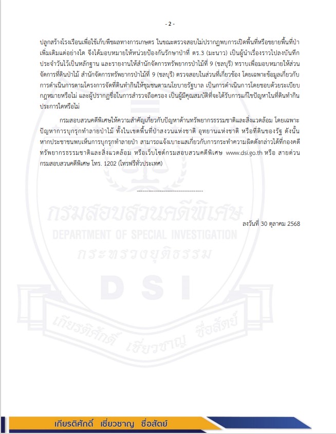 กรมสอบสวนคดีพิเศษให้ความสำคัญเกี่ยวกับปัญหาด้านทรัพยากรธรรมชาติและสิ่งแวดล้อม โดยเฉพาะปัญหาการบุกรุกทำลายป่าไม้ ทั้งในเขตพื้นที่ป่าสงวนแห่งชาติ อุทยานแห่งชาติ หรือที่ดินของรัฐ ดังนั้น หากประชาชนพบเห็นการบุกรุกทำลายป่า สามารถแจ้งเบาะแสเกี่ยวกับการกระทำความผิดดังกล่าวได้ที่กองคดีทรัพยากรธรรมชาติและสิ่งแวดล้อม หรือเว็บไซต์กรมสอบสวนคดีพิเศษ www.dsi.go.th หรือ สายด่วน กรมสอบสวนคดีพิเศษ โทร. 1202 (โทรฟรีทั่วประเทศ)