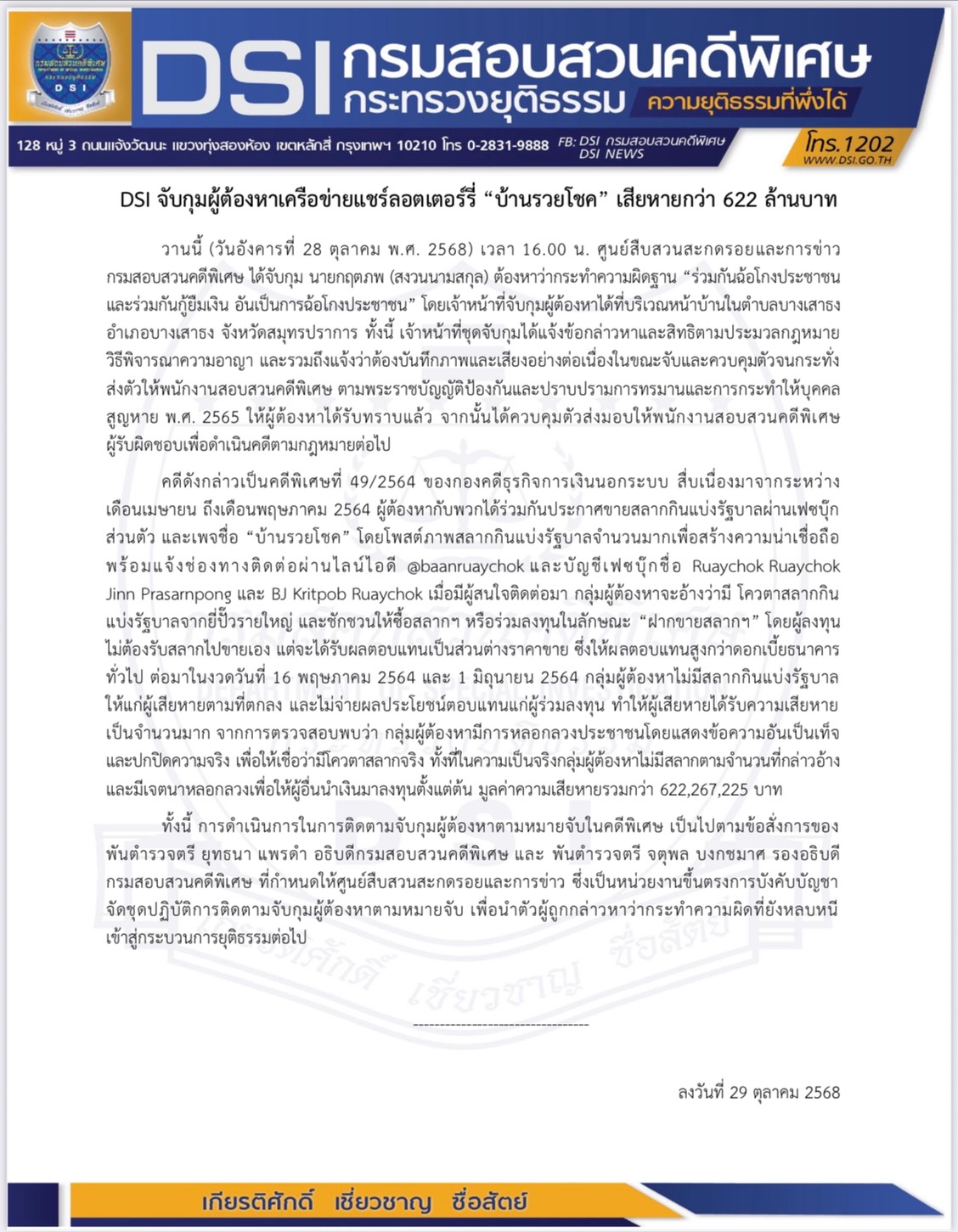 published: 10/29/2025 4:30:19 PM updated: 10/29/2025 4:34:51 PM 99 viewsDSI จับกุมผู้ต้องหาเครือข่ายแชร์ลอตเตอร์รี่ “บ้านรวยโชค” เสียหายกว่า 622 ล้านบาท