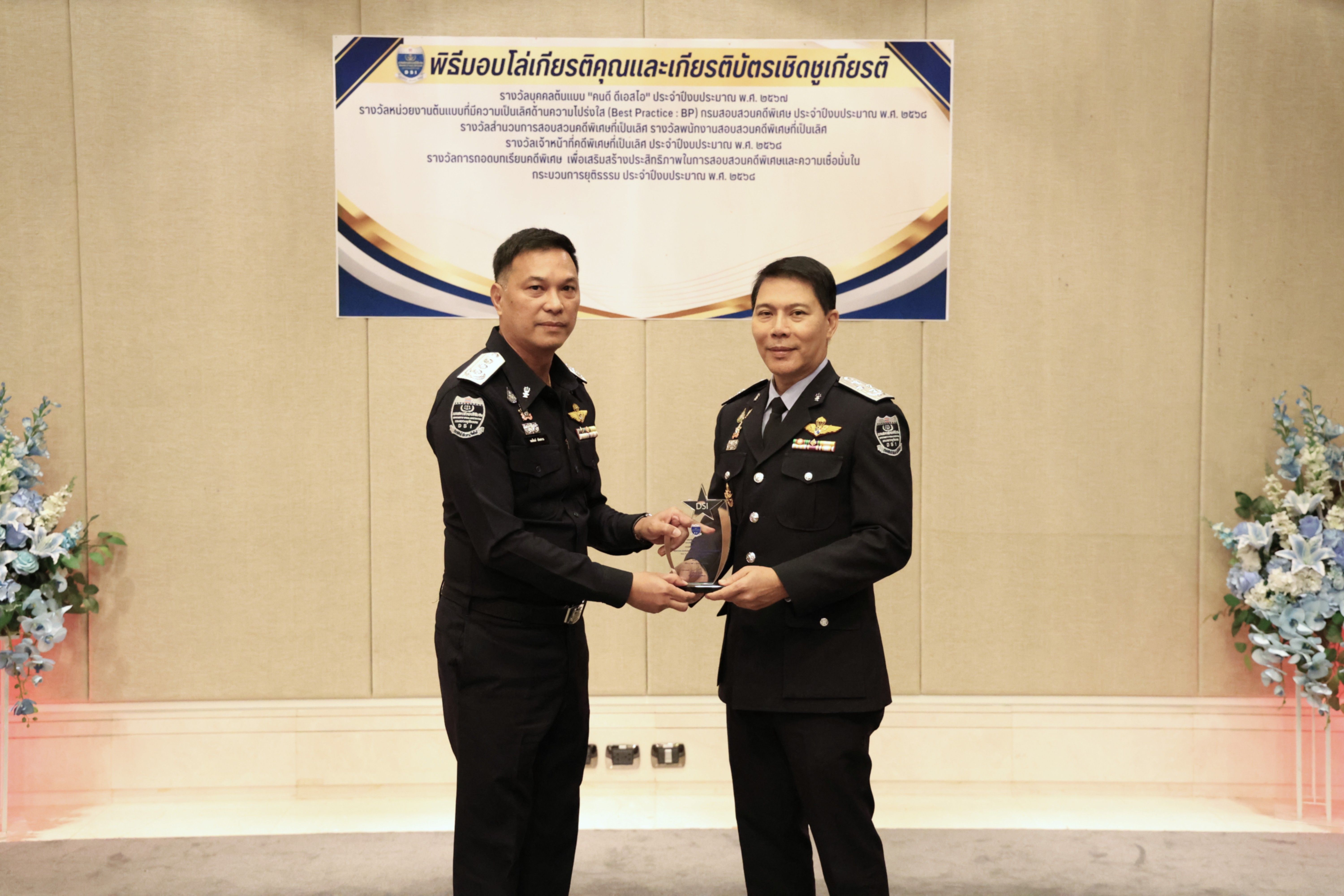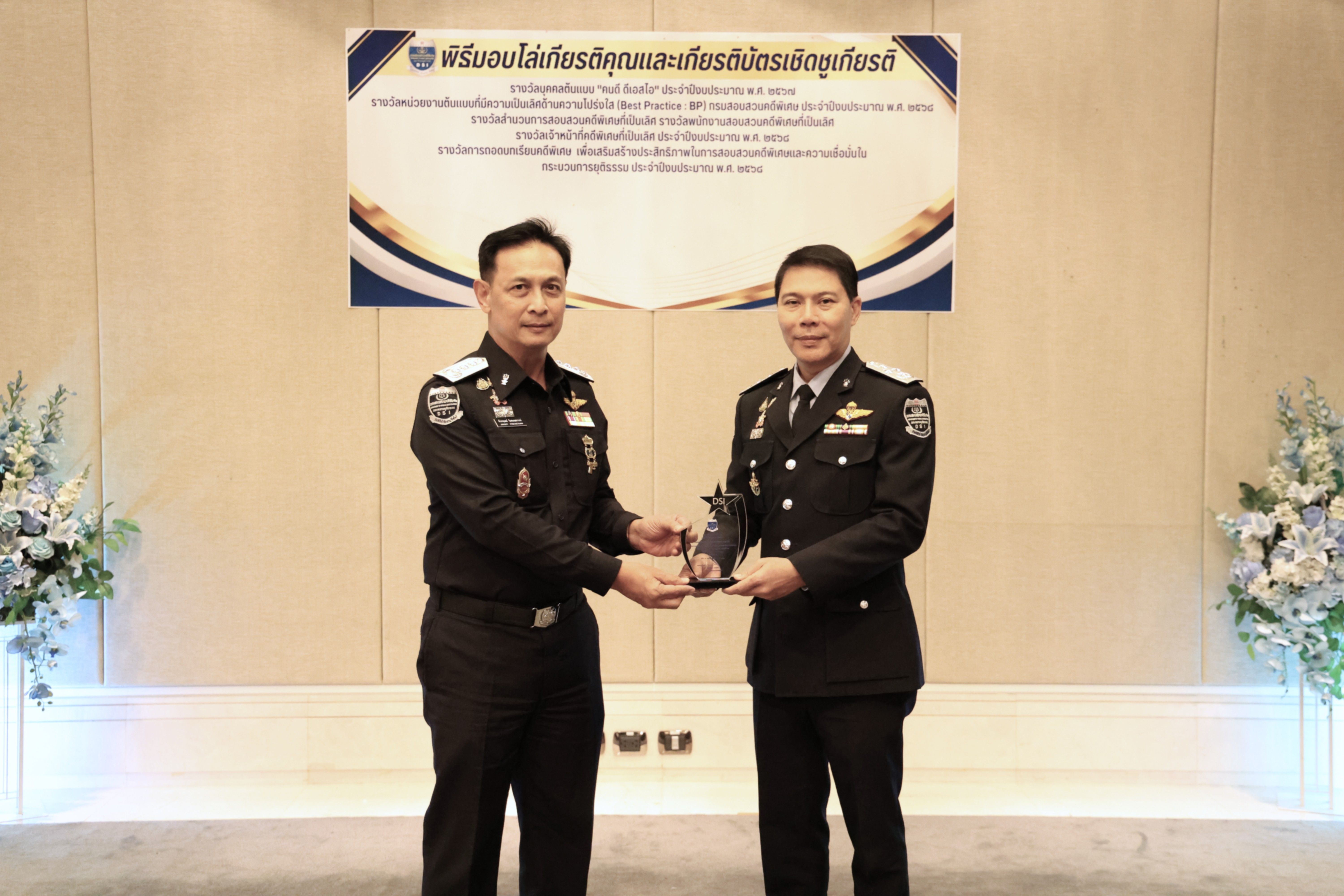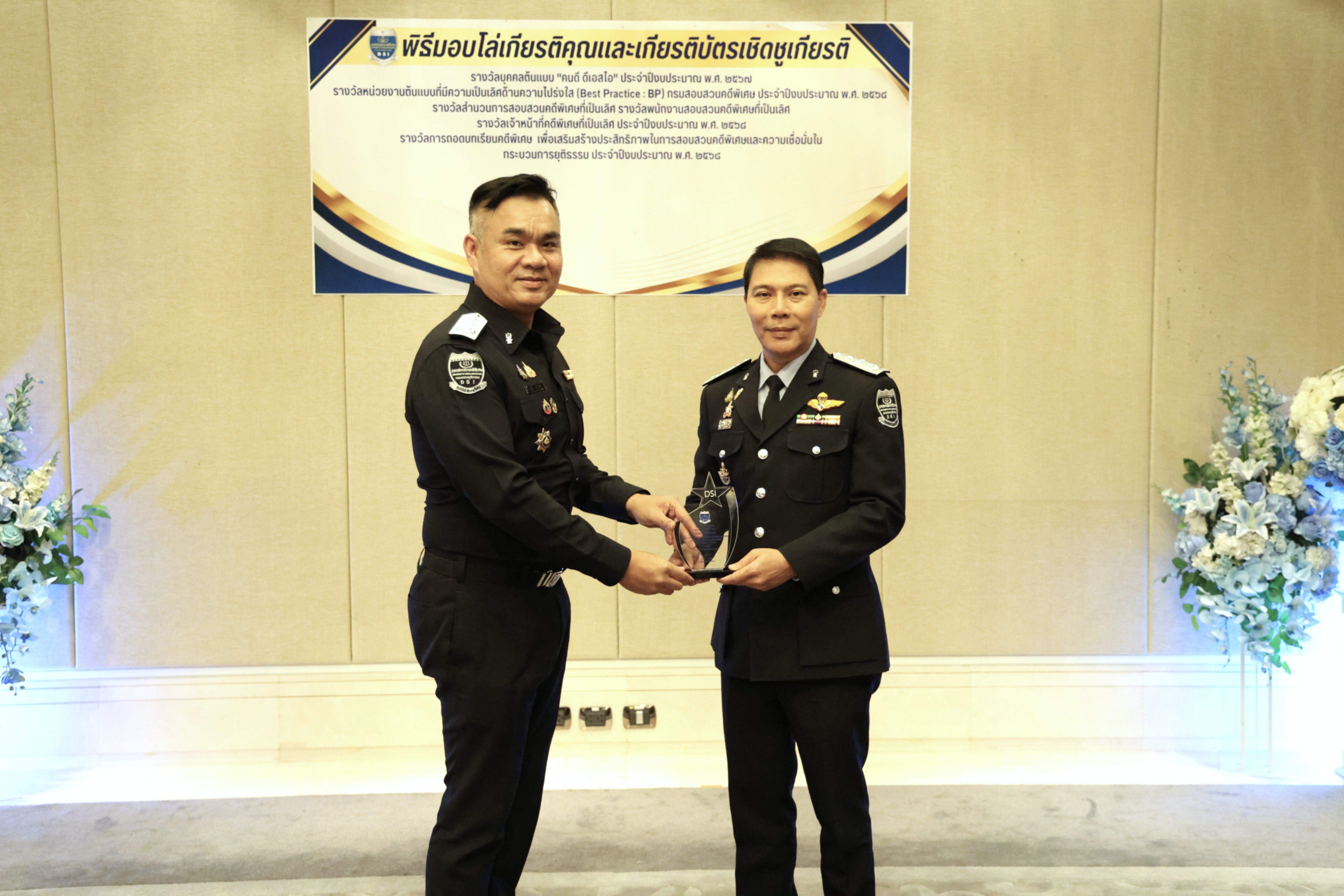 อธิบดีกรมสอบสวนคดีพิเศษมอบรางวัลบุคคลต้นแบบ “คนดี ดีเอสไอ” และรางวัลหน่วยงานต้นแบบที่มีความเป็นเลิศด้านความโปร่งใส (Best Practice : BP) ของกรมสอบสวนคดีพิเศษ