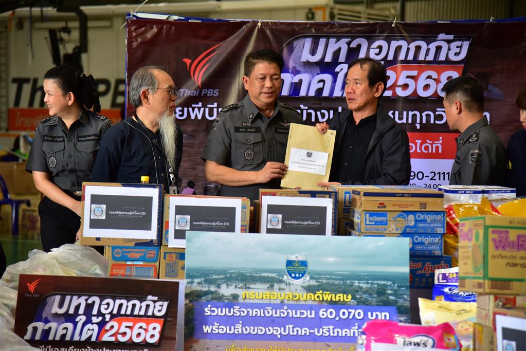 (1 ธ.ค.68) ร้อยตำรวจเอก ธรรศ เลาห์ทวี เลขานุการกรม กรมสอบสวนคดีพิเศษ DSI เป็นผู้แทนนำสิ่งของอุปโภค-บริโภค-อุปกรณ์ทำความสะอาด-อาหารสัตว์เลี้ยง-ของใช้เด็ก สิ่งของจำเป็นต่างๆ หลายรายการ นอกจากนี้ทางเจ้าหน้าที่กรมสอบสวนคดีพิเศษ ได้รวบรวมเงินบริจาค 60,070 บาท มอบผ่านไทยพีบีเอส โดยมี นายวันชัย ตันติวิทยาพิทักษ์ ผอ.สสท. นายสมชัย พุทธจันทนา รอง ผอ.สสท. ด้านสร้างสรรค์เนื้อหา และนางสาวปภาภรณ์ เฉลิมวนิชย์ ผอ.ศูนย์สื่อสารและส่งเสริมการตลาดเพื่อสาธารณะ ไทยพีบีเอส เป็นผู้แทนรับมอบ .