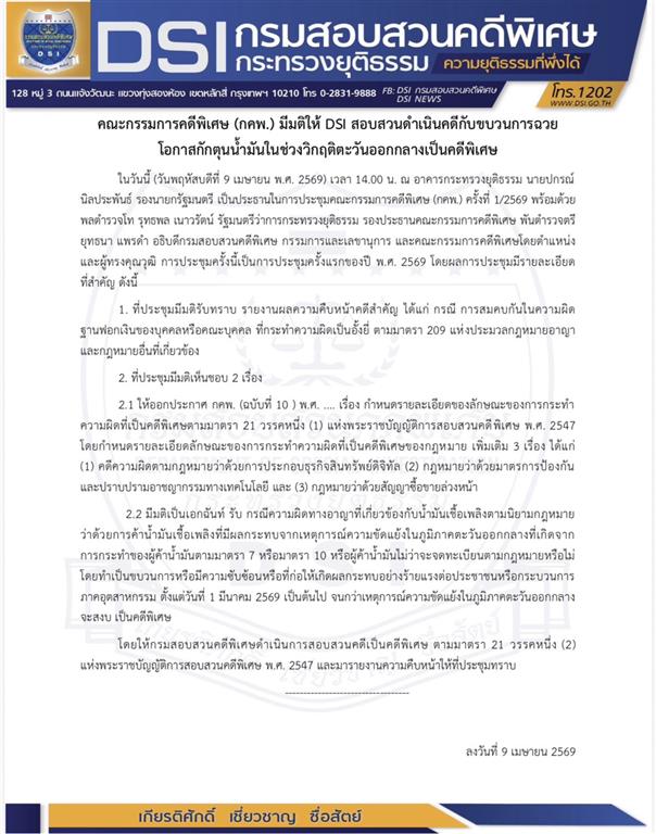 คณะกรรมการคดีพิเศษ (กคพ.) มีมติให้ DSI สอบสวนดำเนินคดีกับขบวนการฉวยโอกาสกักตุนน้ำมันในช่วงวิกฤติตะวันออกกลางเป็นคดีพิเศษ