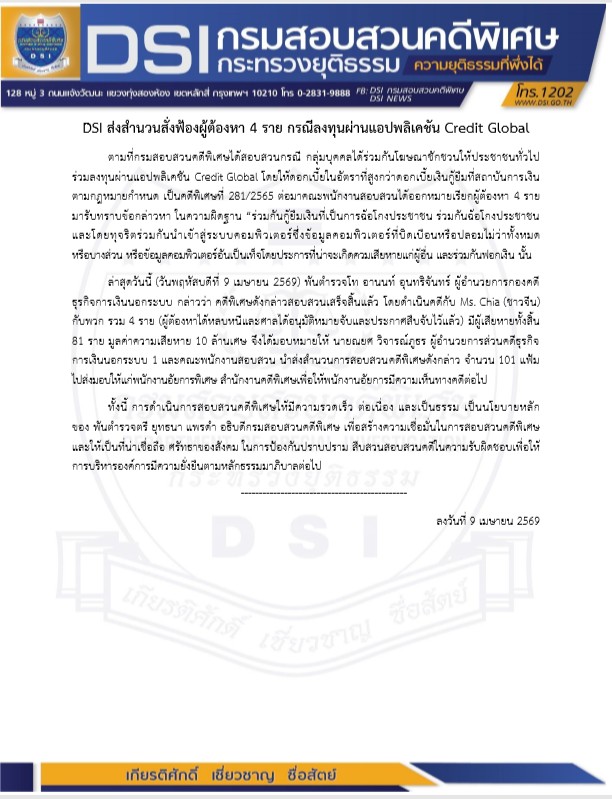 published: 4/9/2026 5:40:59 PM updated: 4/9/2026 6:08:41 PM 46 viewsDSI ส่งสำนวนสั่งฟ้องผู้ต้องหา 4 ราย กรณีลงทุนผ่านแอปพลิเคชัน Credit Global