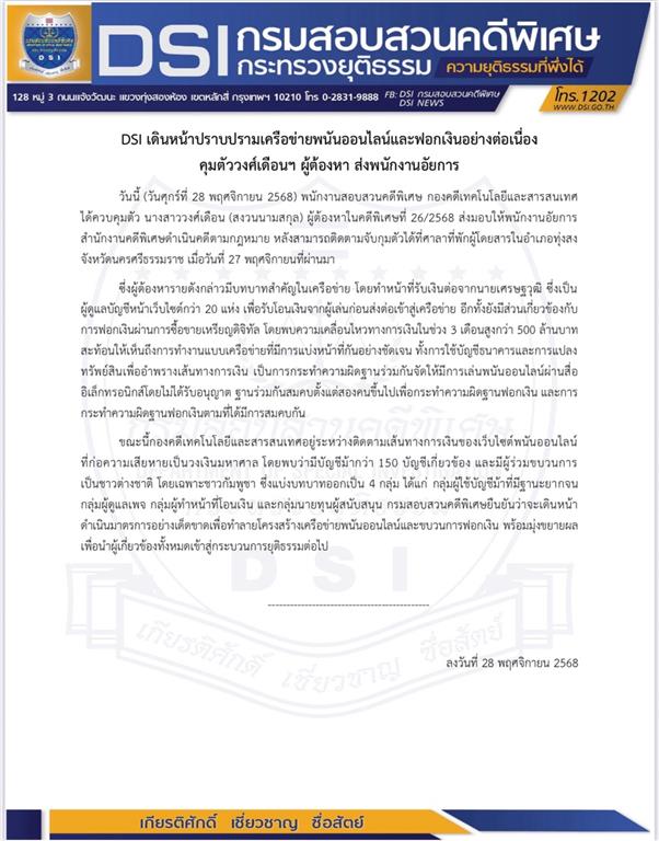 published: 11/28/2025 3:33:13 PM updated: 11/28/2025 3:37:38 PM 41 viewsDSI เดินหน้าปราบปรามเครือข่ายพนันออนไลน์และฟอกเงินอย่างต่อเนื่อง คุมตัววงศ์เดือนฯ ผู้ต้องหา ส่งพนักงานอัยการ