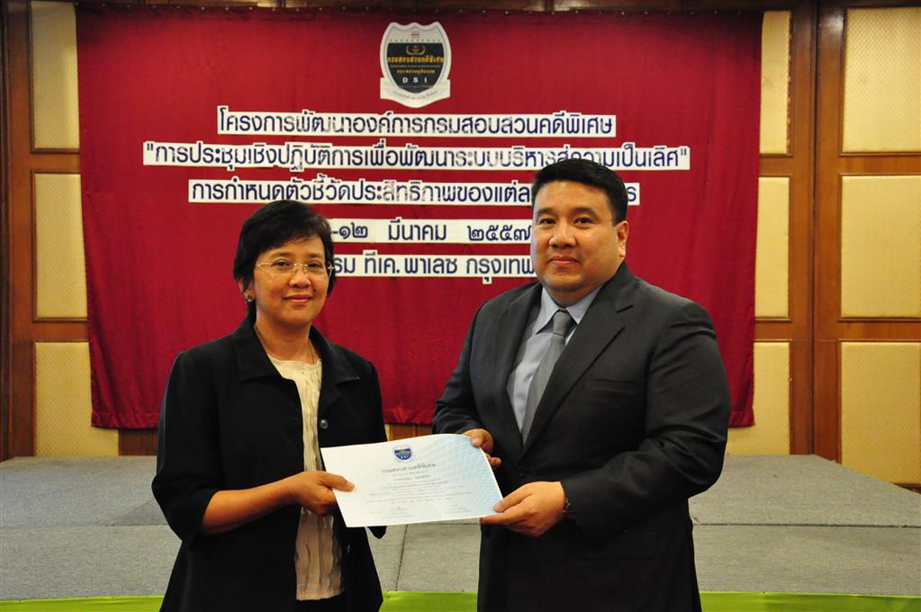published: 3/14/2014 12:06:48 PM updated: 3/14/2014 12:06:48 PM 1598 viewsเมื่อวันที่ 12 มีนาคม 2557 พ.ต.ท.วรรณพงษ์ คชรักษ์ รองอธิบดีกรมสอบสวนคดีพิเศษ เป็นประธานในพิธีปิดและให้เกียรติมอบเกียรติบัตรแก่ผู้เข้าฝึกอบรมในโครงการพัฒนาองค์การกรมสอบสวนคดีพิเศษ "การประชุมเชิงปฏิบัติการเพื่อพัฒนาระบบบริหารสู่ความเป็นเลิศ" ทบทวนการจัดการกระบวนการโดยใช้ PMQA ณ โรงแรมทีเค. พาเลซ กรุงเทพฯ