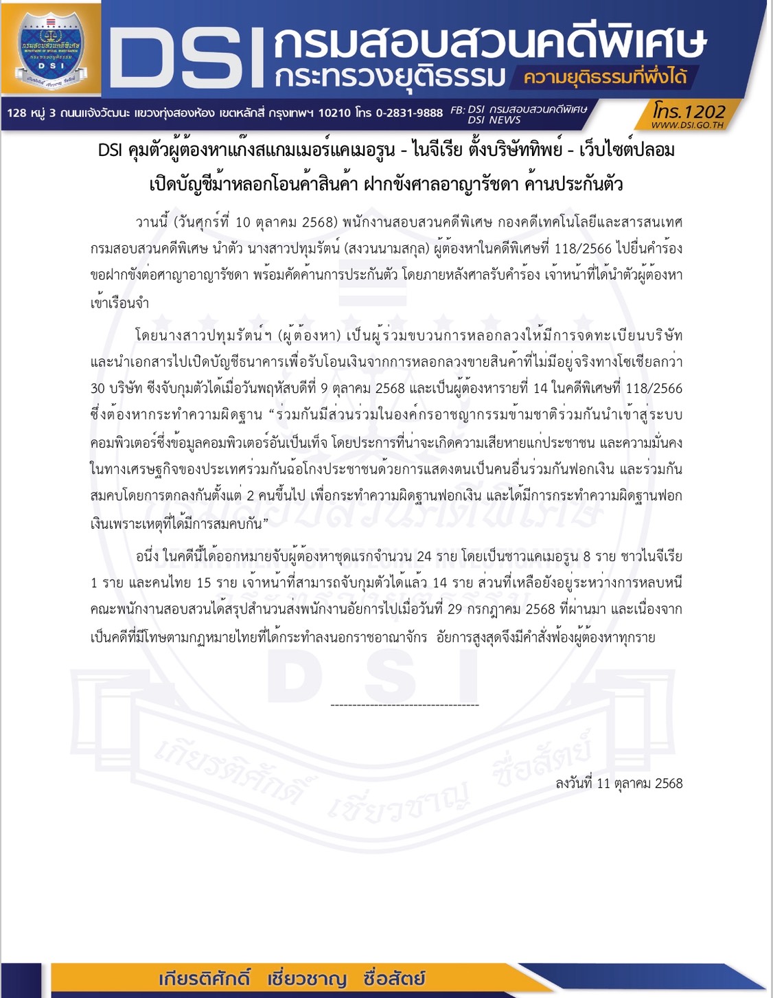 DSI คุมตัวผู้ต้องหาแก๊งสแกมเมอร์แคเมอรูน - ไนจีเรีย ตั้งบริษัททิพย์ - เว็บไซต์ปลอม เปิดบัญชีม้าหลอกโอนค้าสินค้า ฝากขังศาลอาญารัชดา ค้านประกันตัว