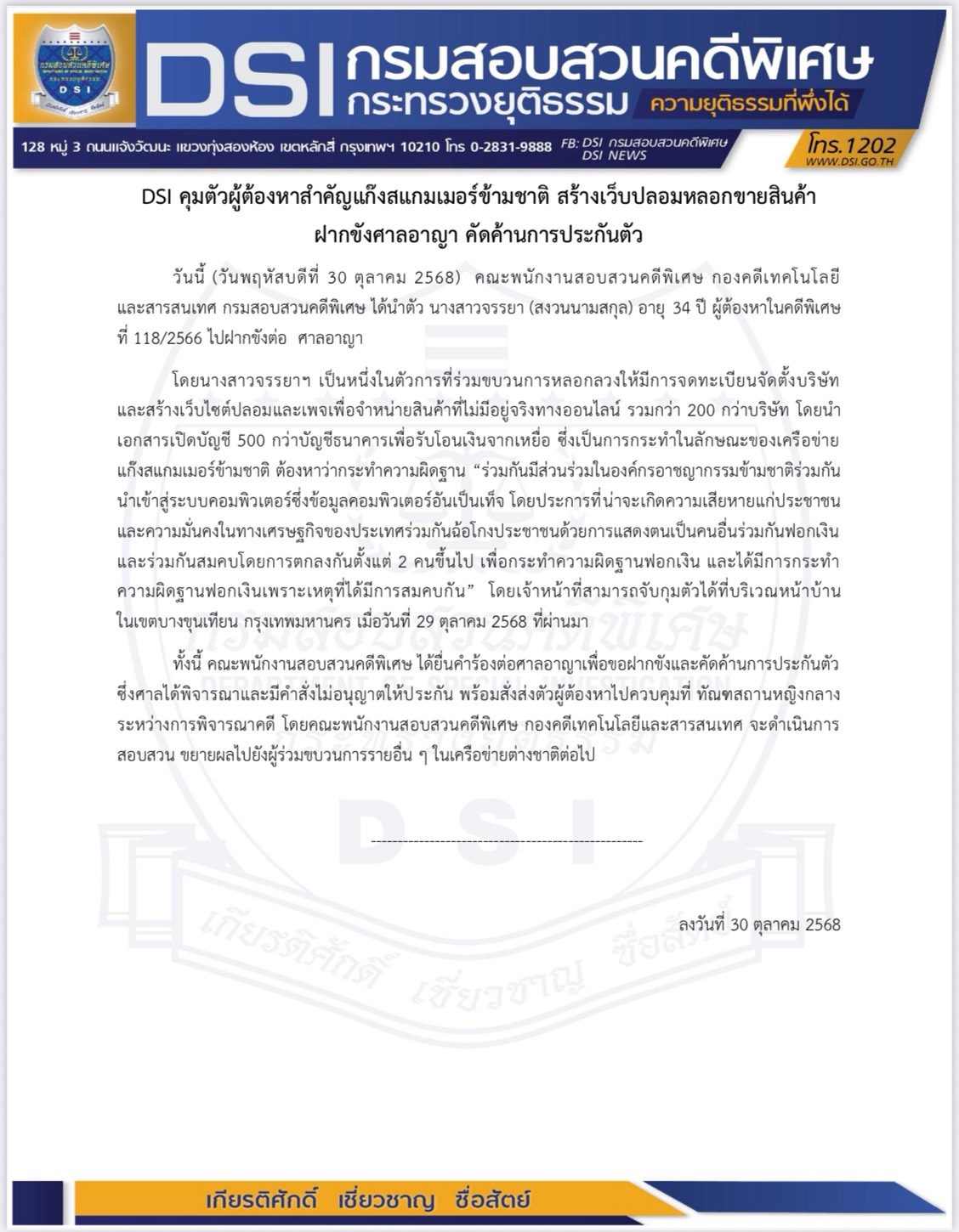 DSI คุมตัวผู้ต้องหาสำคัญแก๊งสแกมเมอร์ข้ามชาติ สร้างเว็บปลอมหลอกขายสินค้า ฝากขังศาลอาญา คัดค้านการประกันตัว