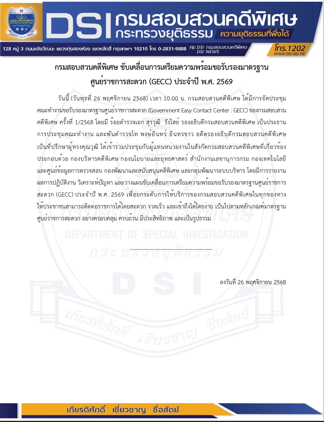 กรมสอบสวนคดีพิเศษ ขับเคลื่อนการเตรียมความพร้อมขอรับรองมาตรฐาน ศูนย์ราชการสะดวก (GECC) ประจำปี พ.ศ. 2569