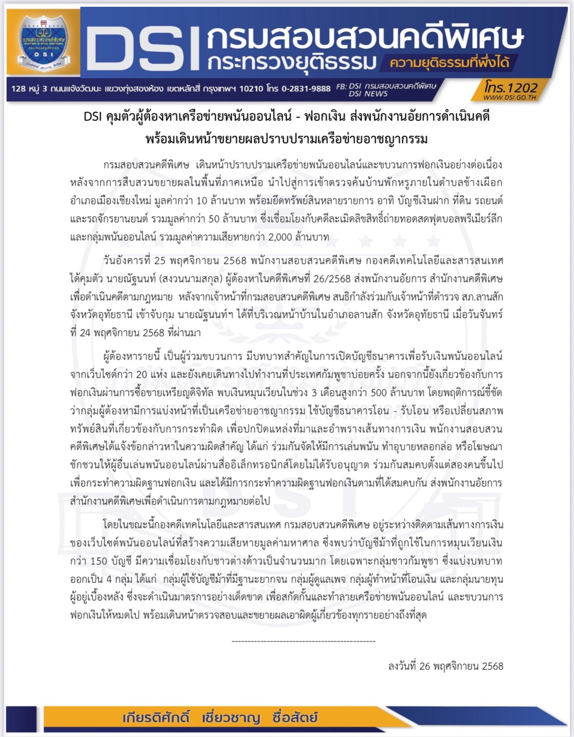 published: 11/27/2025 7:45:10 AM updated: 11/27/2025 8:04:23 AM 14 viewsDSI คุมตัวผู้ต้องหาเครือข่ายพนันออนไลน์ - ฟอกเงินส่งพนักงานอัยการดำเนินคดี