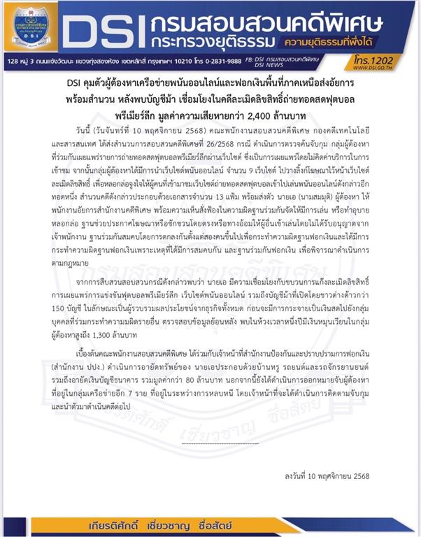 วันจันทร์ที่ 10 พฤศจิกายน 2568 คณะพนักงานสอบสวนคดีพิเศษ กองคดีเทคโนโลยีและสารสนเทศ ได้ส่งสำนวนการสอบสวนคดีพิเศษที่ 26/2568 กรณี ดำเนินการตรวจค้นจับกุม กลุ่มผู้ต้องหาที่ร่วมกันเผยแพร่รายการถ่ายทอดสดฟุตบอลพรีเมียร์ลีกผ่านเว็บไซต์ ซึ่งเป็นการเผยแพร่โดยไม่คิดค่าบริการในการเข้าชม จากนั้นกลุ่มผู้ต้องหาได้มีการนำเว็บไซต์พนันออนไลน์ จำนวน 9 เว็บไซต์ ไปวางลิ้งก์โฆษณาไว้หน้าเว็บไซต์ละเมิดลิขสิทธิ์ เพื่อหลอกล่อจูงใจให้ผู้คนที่เข้ามาชมเว็บไซต์ถ่ายทอดสดฟุตบอลเข้าไปเล่นพนันออนไลน์ดังกล่าวอีกทอดหนึ่ง สำนวนคดีดังกล่าวประกอบด้วยเอกสารจำนวน 13 แฟ้ม พร้อมส่งตัว นายเอ (นามสมมุติ) ผู้ต้องหา ให้พนักงานอัยการสำนักงานคดีพิเศษ พร้อมความเห็นสั่งฟ้องในความผิดฐานร่วมกันจัดให้มีการเล่น หรือทำอุบายหลอกล่อ ฐานช่วยประกาศโฆษณาหรือชักชวนโดยตรงหรือทางอ้อมให้ผู้อื่นเข้าเล่นโดยไม่ได้รับอนุญาตจากเจ้าพนักงานฐานร่วมกันสมคบโดยการตกลงกันตั้งแต่สองคนขึ้นไปเพื่อกระทำความผิดฐานฟอกเงินและได้มีการกระทำความผิดฐานฟอกเงินเพราะเหตุที่ได้มีการสมคบกัน และฐานร่วมกันฟอกเงิน เพื่อพิจารณาดำเนินการตามกฎหมาย