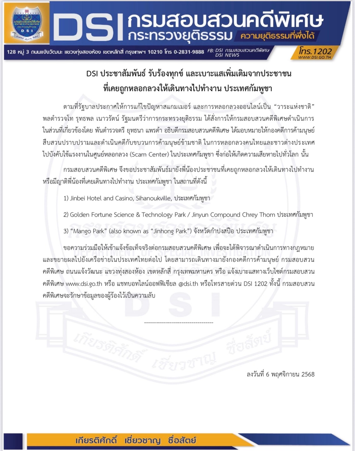 DSI ประชาสัมพันธ์ รับร้องทุกข์ และเบาะแสเพิ่มเติมจากประชาชน ที่เคยถูกหลอกลวงให้เดินทางไปทำงาน ประเทศกัมพูชา