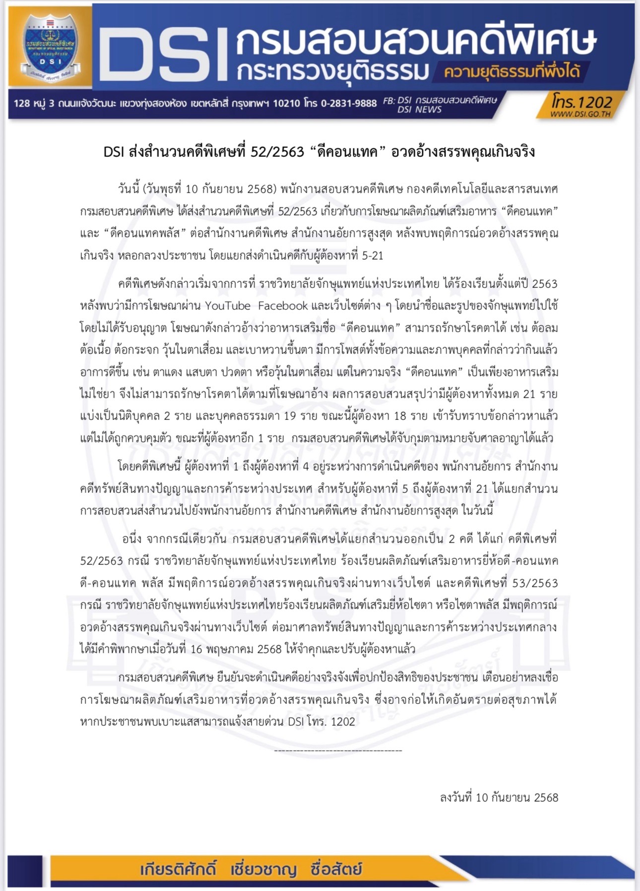 วันนี้ (วันพุธที่ 10 กันยายน 2568) พนักงานสอบสวนคดีพิเศษ กองคดีเทคโนโลยีและสารสนเทศ กรมสอบสวนคดีพิเศษ ได้ส่งสำนวนคดีพิเศษที่ 52/2563 เกี่ยวกับการโฆษณาผลิตภัณฑ์เสริมอาหาร “ดีคอนแทค” และ “ดีคอนแทคพลัส” ต่อสำนักงานคดีพิเศษ สำนักงานอัยการสูงสุด หลังพบพฤติการณ์อวดอ้างสรรพคุณเกินจริง หลอกลวงประชาชน โดยแยกส่งดำเนินคดีกับผู้ต้องหาที่ 5-21