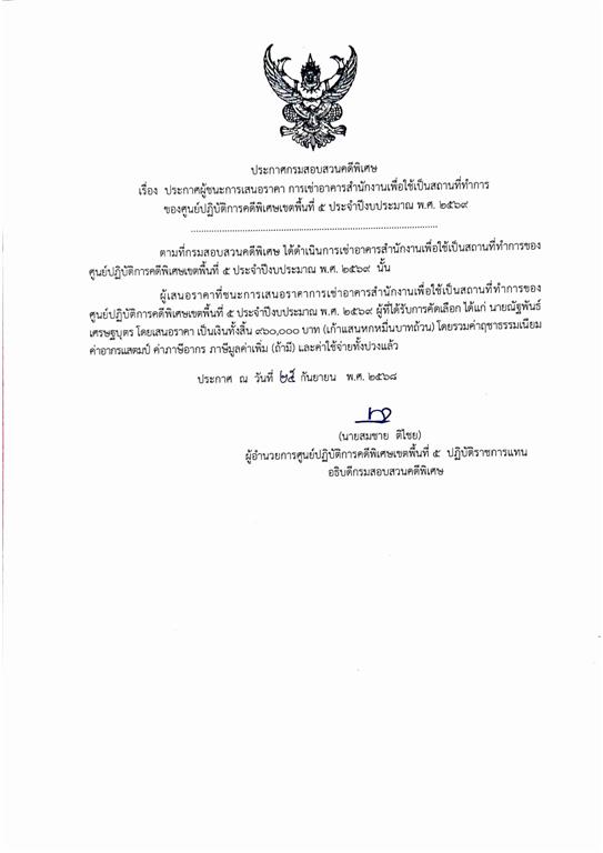 ประกาศผู้ชนะการเสนอราคา การเช่าอาคารเพื่อเป็นสถานที่ทำการของศูนย์ปฏิบัติการคดีพิเศษเขตพื้นที่ 5 ประจำปีงบประมาณ พ.ศ.2569