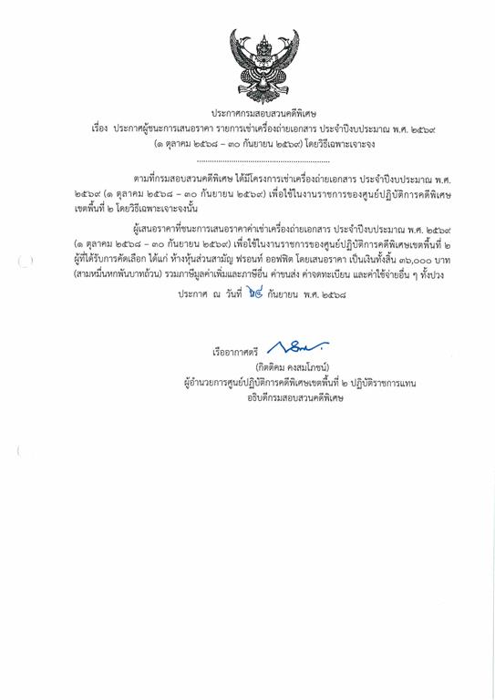 ประกาศผู้ชนะการเสนอราคารายการค่าเช่าเครื่องถ่ายเอกสาร ศูนย์ปฏิบัติการคดีพิเศษเขตพื้นที่ ๒ ประจำปีงบประมาณ พ.ศ. ๒๕๖๙