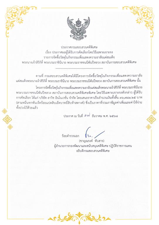 ประกาศผลผู้ได้รับการคัดเลือกโดยวิธีเฉพาะเจาะจง รายการจัดซื้อวัสดุในกิจกรรมเพื่อแสดงความอาลัยแด่สมเด็จพระนางเจ้าสิริกิติ์ พระบรมราชินีนาถ พระบรมราชชนนีพันปีหลวง สถาบันการสอบสวนคดีพิเศษ