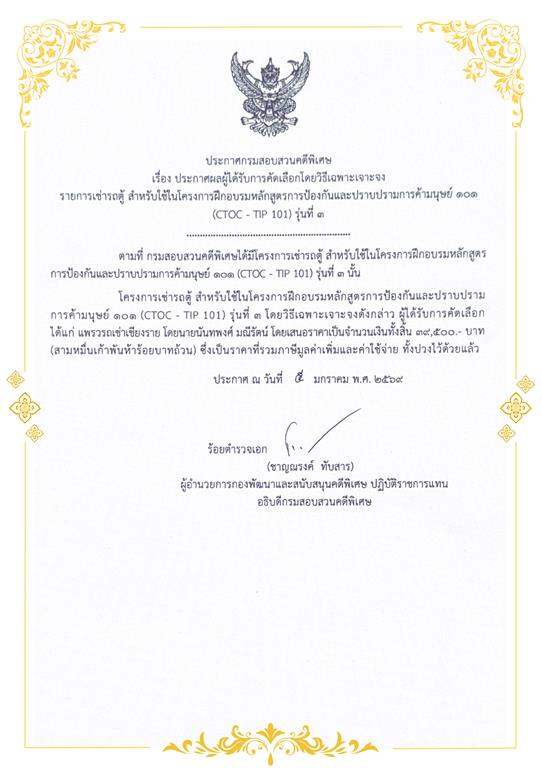 ประกาศผลผู้ได้รับการคัดเลือกโดยวิธีเฉพาะเจาะจง รายการเช่ารถตู้ สำหรับใช้ในโครงการฝึกอบรมหลักสูตรการป้องกันและปราบปรามการค้ามนุษย์ 101 (CTOC - TIP 101) รุ่นที่ 3