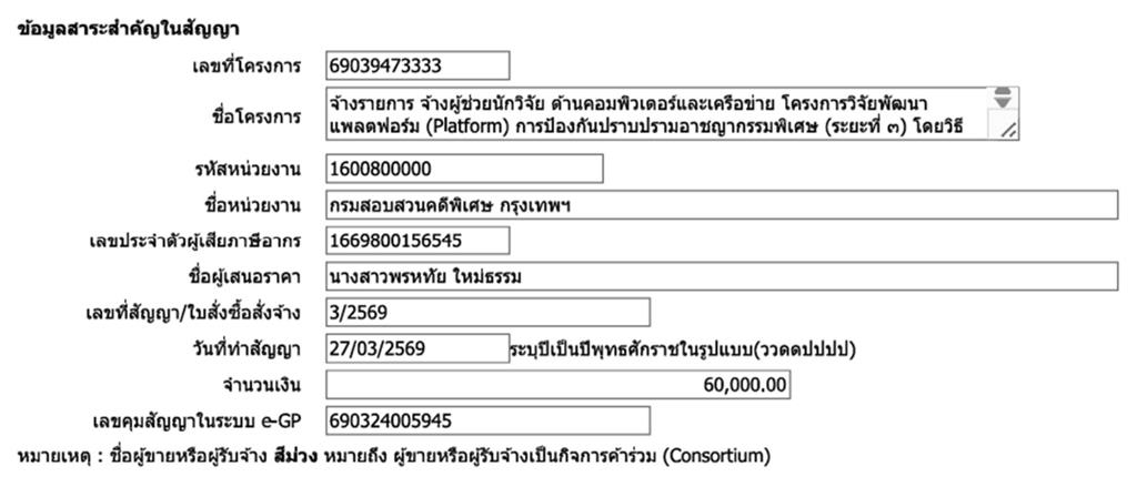 สาระสำคัญในสัญญา รายการ จ้างผู้ช่วยนักวิจัย ด้านคอมพิวเตอร์และเครือข่าย โครงการวิจัยพัฒนาแพลตฟอร์ม (Platform) การป้องกันปราบปรามอาชญากรรมพิเศษ (ระยะที่ 3) โดยวิธีเฉพาะเจาะจง