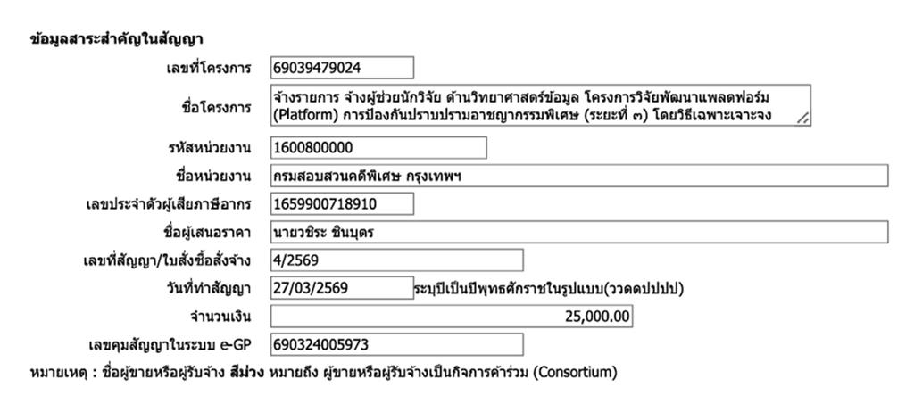 สาระสำคัญในสัญญา รายการ จ้างผู้ช่วยนักวิจัย ด้านวิทยาศาสตร์ข้อมูล โครงการวิจัยพัฒนาแพลตฟอร์ม (Platform) การป้องกันปราบปรามอาชญากรรมพิเศษ (ระยะที่ 3) โดยวิธีเฉพาะเจาะจง