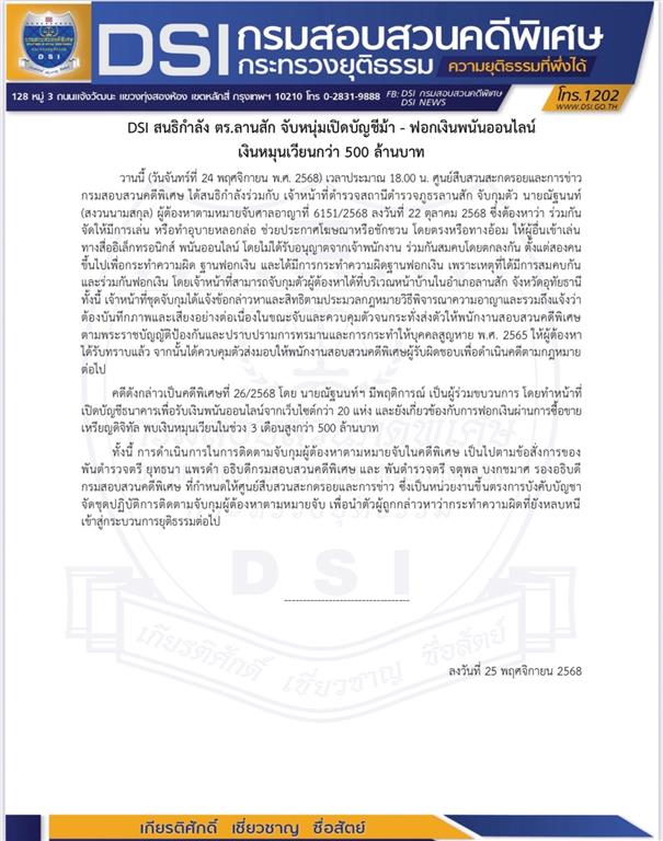 เผยแพร่: 26 พ.ย. 2568 13:34 น. ปรับปรุง: 26 พ.ย. 2568 13:34 น. เปิดอ่าน 27 ครั้งDSI สนธิกำลัง ตร.ลานสัก จับหนุ่มเปิดบัญชีม้า - ฟอกเงินพนันออนไลน์ เงินหมุนเวียนกว่า 500 ล้านบาท