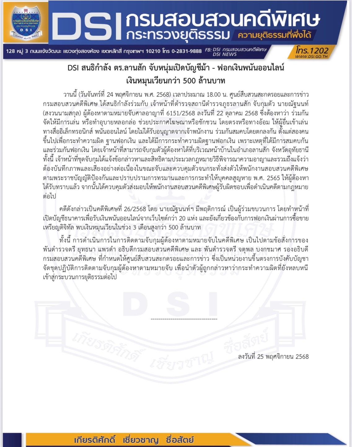 วานนี้ (วันจันทร์ที่ 24 พฤศจิกายน พ.ศ. 2568) เวลาประมาณ 18.00 น. ศูนย์สืบสวนสะกดรอยและการข่าว กรมสอบสวนคดีพิเศษ ได้สนธิกำลังร่วมกับ เจ้าหน้าที่ตำรวจสถานีตำรวจภูธรลานสัก จับกุมตัว นายณัฐนนท์ (สงวนนามสกุล) ผู้ต้องหาตามหมายจับศาลอาญาที่ 6151/2568 ลงวันที่ 22 ตุลาคม 2568 ซึ่งต้องหาว่า ร่วมกันจัดให้มีการเล่น หรือทำอุบายหลอกล่อ ช่วยประกาศโฆษณาหรือชักชวน โดยตรงหรือทางอ้อม ให้ผู้อื่นเข้าเล่นทางสื่ออิเล็กทรอนิกส์ พนันออนไลน์ โดยไม่ได้รับอนุญาตจากเจ้าพนักงาน ร่วมกันสมคบโดยตกลงกัน ตั้งแต่สองคนขึ้นไปเพื่อกระทำความผิด ฐานฟอกเงิน และได้มีการกระทำความผิดฐานฟอกเงิน เพราะเหตุที่ได้มีการสมคบกัน และร่วมกันฟอกเงิน โดยเจ้าหน้าที่สามารถจับกุมตัวผู้ต้องหาได้ที่บริเวณหน้าบ้านในอำเภอลานสัก จังหวัดอุทัยธานี ทั้งนี้ เจ้าหน้าที่ชุดจับกุมได้แจ้งข้อกล่าวหาและสิทธิตามประมวลกฎหมายวิธีพิจารณาความอาญาและรวมถึงแจ้งว่าต้องบันทึกภาพและเสียงอย่างต่อเนื่องในขณะจับและควบคุมตัวจนกระทั่งส่งตัวให้พนักงานสอบสวนคดีพิเศษ ตามพระราชบัญญัติป้องกันและปราบปรามการทรมานและการกระทำให้บุคคลสูญหาย พ.ศ. 2565 ให้ผู้ต้องหาได้รับทราบแล้ว จากนั้นได้ควบคุมตัวส่งมอบให้พนักงานสอบสวนคดีพิเศษผู้รับผิดชอบเพื่อดำเนินคดีตามกฎหมายต่อไป