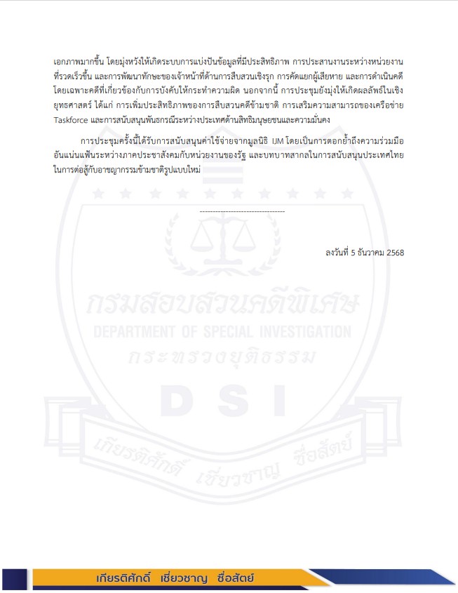 วันพฤหัสบดีที่ 4 ธันวาคม 2568 พันตำรวจตรี ยุทธนา แพรดำ อธิบดีกรมสอบสวนคดีพิเศษ มอบหมายให้ ร้อยตำรวจเอก สุรวุฒิ รังไสย์ รองอธิบดีกรมสอบสวนคดีพิเศษ เป็นประธานในการประชุม “The 2025 Joint Taskforce on Human Trafficking, Forced Labour, and Forced Criminality” หรือTASKFORCE2025 โดยจัดขึ้น ณ สโมสรราชพฤกษ์ เขตหลักสี่ กรุงเทพมหานคร