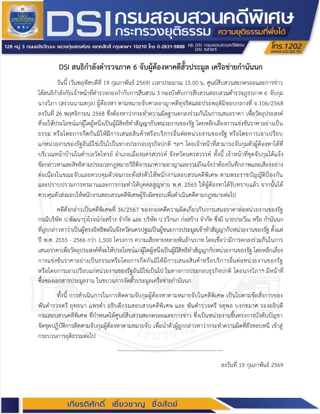 วันพฤหัสบดีที่ 19 กุมภาพันธ์ 2569 เวลาประมาณ 15.00 น. ศูนย์สืบสวนสะกดรอยและการข่าว ได้สนธิกำลังกับเจ้าหน้าที่ตำรวจกองกำกับการสืบสวน 3 กองบังคับการสืบสวนสอบสวนตำรวจภูธรภาค 6 จับกุม นางวิภา (สงวนนามสกุล) ผู้ต้องหา ตามหมายจับศาลอาญาคดีทุจริตและประพฤติมิชอบกลางที่ จ.106/2568 ลงวันที่ 26 พฤศจิกายน 2568 ซึ่งต้องหาว่ากระทำความผิดฐานตกลงร่วมกันในการเสนอราคา เพื่อวัตถุประสงค์ที่จะให้ประโยชน์แก่ผู้ใดผู้หนึ่งเป็นผู้มีสิทธิทำสัญญากับหน่วยงานของรัฐ โดยหลีกเลี่ยงการแข่งขันราคาอย่างเป็นธรรม หรือโดยการกีดกันมิให้มีการเสนอสินค้าหรือบริการอื่นต่อหน่วยงานของรัฐ หรือโดยการเอาเปรียบแก่หน่วยงานของรัฐอันมิใช่เป็นไปในทางประกอบธุรกิจปกติ ฯลฯ โดยเจ้าหน้าที่สามารถจับกุมตัวผู้ต้องหาได้ที่บริเวณหน้าบ้านในตำบลวัดไทรย์ อำเภอเมืองนครสวรรค์ จังหวัดนครสวรรค์ ทั้งนี้ เจ้าหน้าที่ชุดจับกุมได้แจ้งข้อกล่าวหาและสิทธิตามประมวลฎหมายวิธีพิจารณาความอาญาและรวมถึงแจ้งว่าต้องบันทึกภาพและเสียงอย่างต่อเนื่องในขณะจับและควบคุมตัวจนกระทั่งส่งตัวให้พนักงานสอบสวนคดีพิเศษ ตามพระราชบัญญัติป้องกันและปราบปรามการทรมานและการกระทำให้บุคคลสูญหาย พ.ศ. 2565 ให้ผู้ต้องหาได้รับทราบแล้ว จากนั้นได้ควบคุมตัวส่งมอบให้พนักงานสอบสวนคดีพิเศษผู้รับผิดชอบเพื่อดำเนินคดีตามกฎหมายต่อไป