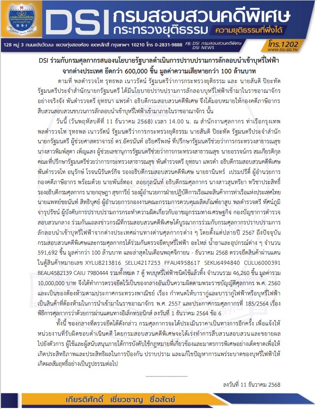 DSI ร่วมกับกรมศุลกากรสนองนโยบายรัฐบาลดำเนินการปราบปรามการลักลอบนำเข้าบุหรี่ไฟฟ้าจากต่างประเทศ ยึดกว่า 600,000 ชิ้น มูลค่าความเสียหายกว่า 100 ล้านบาท
