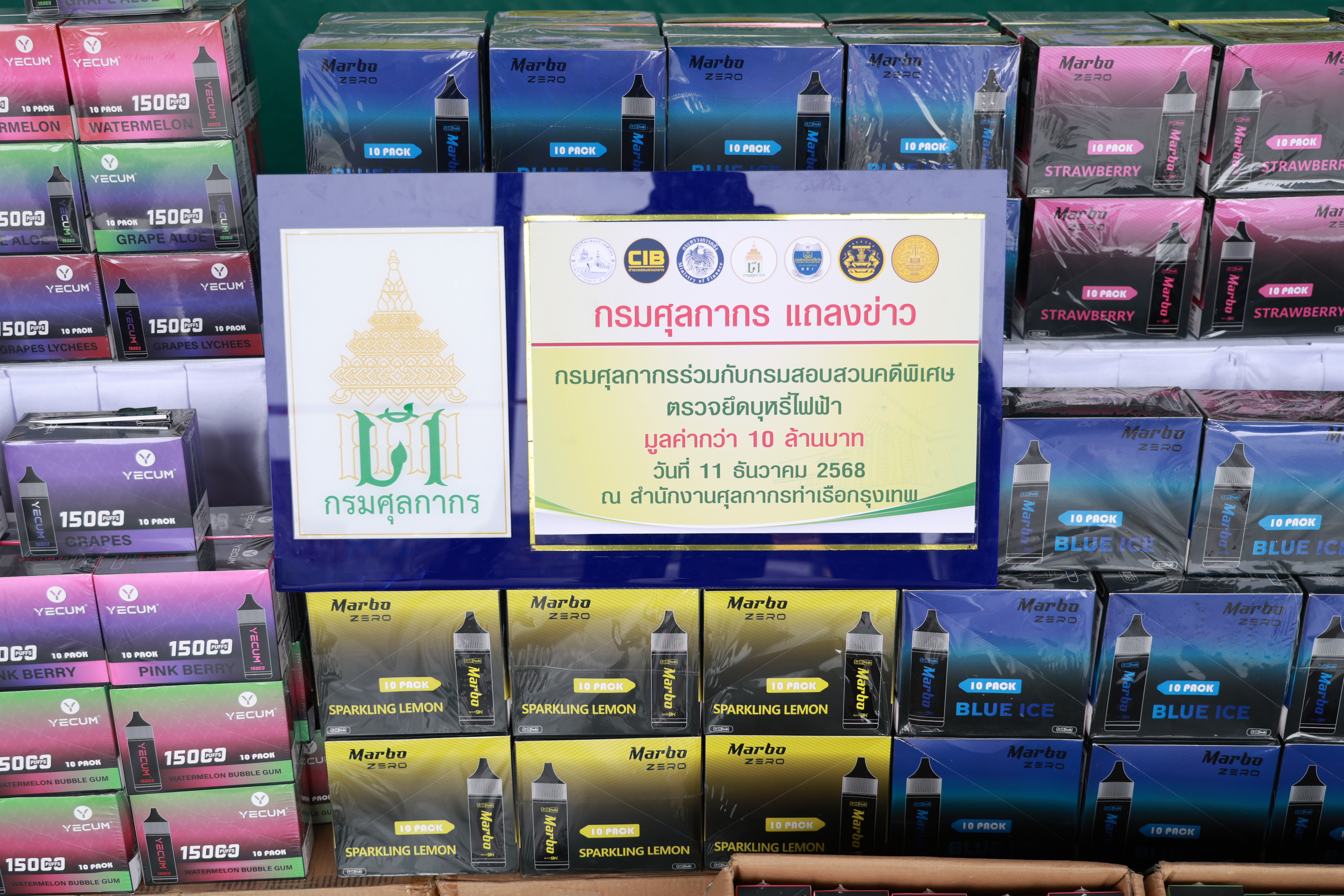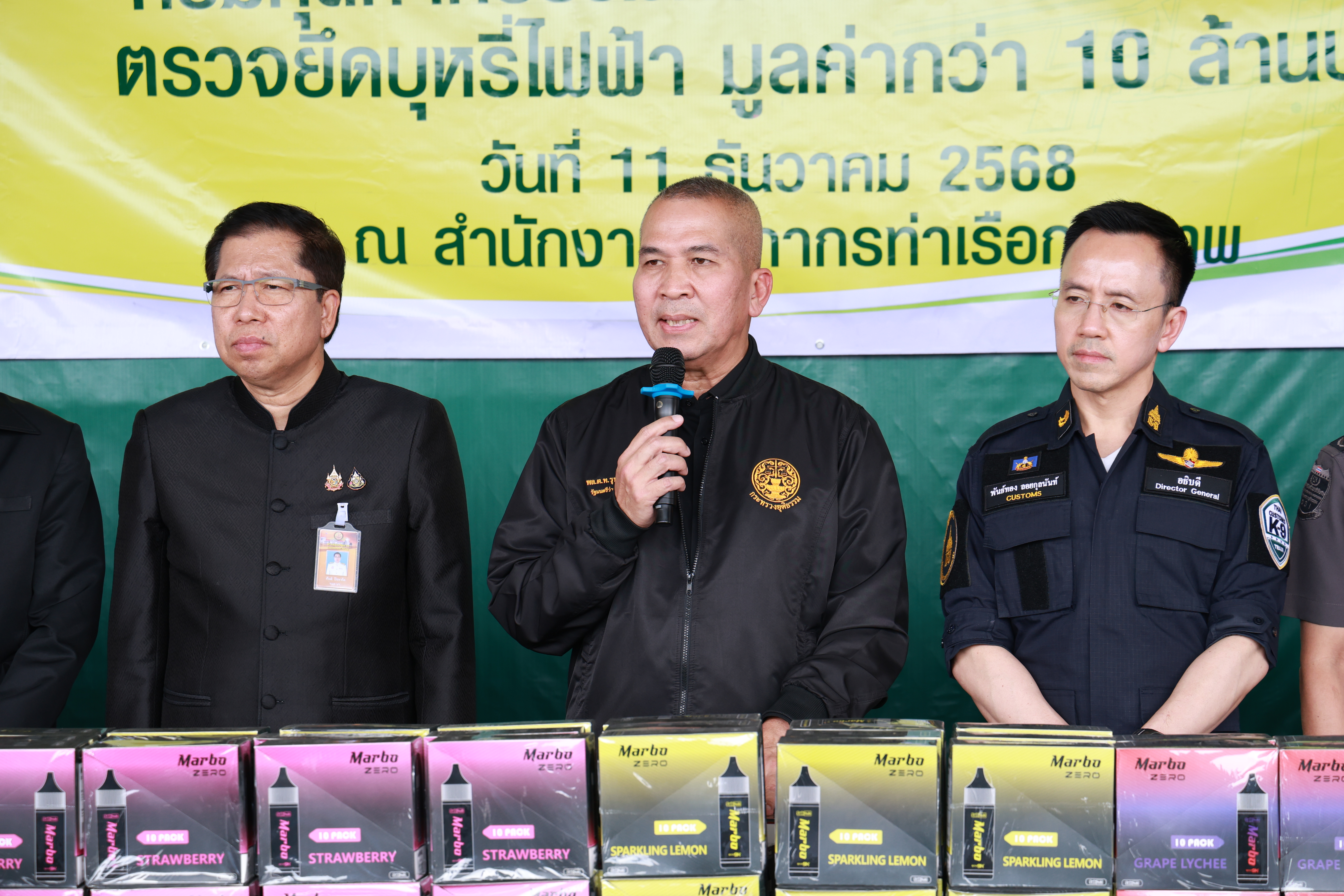 วันนี้ (วันพฤหัสบดีที่ 11 ธันวาคม 2568) เวลา 14.00 น. ณ สำนักงานศุลกากร ท่าเรือกรุงเทพ พลตํารวจโท รุทธพล เนาวรัตน์ รัฐมนตรีว่าการกระทรวงยุติธรรม นายสันติ ปิยะทัต รัฐมนตรีประจำสำนักนายกรัฐมนตรี ผู้ช่วยศาสตราจารย์ ดร.อัครนันท์ อริยศรีพงษ์ ที่ปรึกษารัฐมนตรีช่วยว่าการกระทรวงสาธารณสุข นางสาวพิมพ์สุดา เพ็ญแสง ผู้ช่วยเลขานุการรัฐมนตรีช่วยว่าการกระทรวงสาธารณสุข นายอรรจน์กร สมเกียรติกุล คณะที่ปรึกษารัฐมนตรีช่วยว่าการกระทรวงสาธารณสุข พันตำรวจตรี ยุทธนา แพรดำ อธิบดีกรมสอบสวนคดีพิเศษ พันตำรวจโท อนุรักษ์ โรจนนิรันดร์กิจ รองอธิบดีกรมสอบสวนคดีพิเศษ นายธานินทร์ เปรมปรีดิ์ ผู้อำนวยการกองคดีภาษีอากร พร้อมด้วย นายพันธ์ทอง ลอยกุลนันท์ อธิบดีกรมศุลกากร นางสาวสุนทรียา ทวิชาประสิทธิ์ รองอธิบดีกรมศุลกากร นายกฤษฎา สุขการีย์ รองผู้อำนวยการฝ่ายปฏิบัติการเรือและสินค้าการท่าเรือแห่งประเทศไทย นายแพทย์ชยนันท์ สิทธิบุศย์ ผู้อำนวยการกองงานคณะกรรมการควบคุมผลิตภัณฑ์ยาสูบ พลตำรวจตรี ทัศน์ภูมิ จารุปรัชน์ ผู้บังคับการปราบปรามการกระทำความผิดเกี่ยวกับอาชญกรรมทางเศรษฐกิจ กองบัญชาการตำรวจสอบสวนกลาง ร่วมกันแถลงข่าวกรณีที่กรมสอบสวนคดีพิเศษได้บูรณาการร่วมกับกรมศุลกากรปราบปรามการลักลอบนำเข้าบุหรี่ไฟฟ้าจากต่างประเทศผ่านทางด่านศุลกากรต่าง ๆ โดยตั้งแต่ปลายปี 2567 ถึงปัจจุบัน กรมสอบสวนคดีพิเศษและกรมศุลกากรได้ร่วมกันตรวจยึดบุหรี่ไฟฟ้า อะไหล่ น้ำยาและอุปกรณ์ต่าง ๆ จำนวน 591,692 ชิ้น มูลค่ากว่า 100 ล้านบาท และล่าสุดในเดือนพฤศจิกายน - ธันวาคม 2568 ตรวจยึดสินค้าผ่านแดนในตู้สินค้าหมายเลข XYLU8213816 SELU4217253 FFAU4958617 SEKU6494840 CULU6000391 BEAU4582139 CAIU 7980444 รวมทั้งหมด 7 ตู้ พบบุหรี่ไฟฟ้าชนิดใช้แล้วทิ้ง จำนวนรวม 46,260 ชิ้น มูลค่ารวม 10,000,000 บาท จึงได้ทำการตรวจยึดไว้เป็นของกลางอันเป็นความผิดตามพระราชบัญญัติศุลกากร พ.ศ. 2560 และเป็นของต้องห้ามตามประกาศกระทรวงพาณิชย์ เรื่อง กำหนดให้บารากู่และบารากู่ไฟฟ้าหรือบุหรี่ไฟฟ้าเป็นสินค้าที่ต้องห้ามในการนำเข้ามาในราชอาณาจักร พ.ศ. 2557 และประกาศกรมศุลกากรที่ 185/2564 เรื่อง พิธีการศุลกากรว่าด้วยการผ่านแดนทางอิเล็กทรอนิกส์ ลงวันที่ 1 ธันวาคม 2564 ข้อ 6