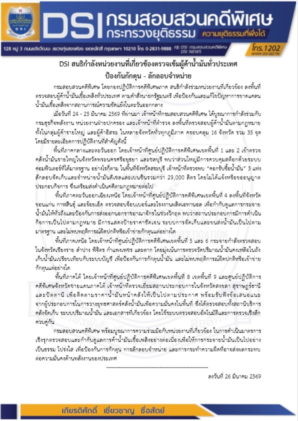 กรมสอบสวนคดีพิเศษ โดยกองปฏิบัติการคดีพิเศษภาค สนธิกำลังร่วมหน่วยงานที่เกี่ยวข้อง ลงพื้นที่ตรวจสอบผู้ค้าน้ำมันเชื้อเพลิงทั่วประเทศ ตามคำสั่งนายกรัฐมนตรี เพื่อป้องกันและแก้ไขปัญหาการขาดแคลนน้ำมันเชื้อเพลิงจากสถานการณ์ความขัดแย้งในตะวันออกกลาง