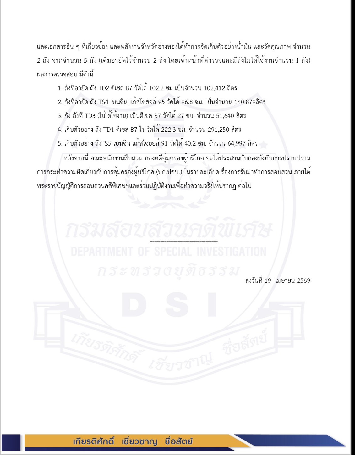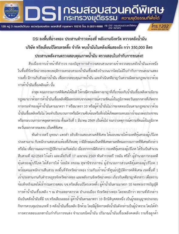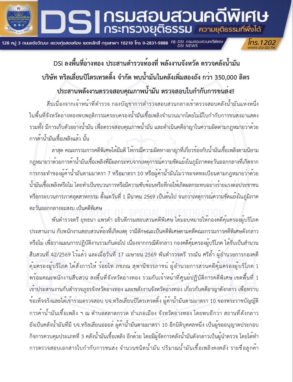 พันตำรวจตรี ยุทธนา แพรดำ อธิบดีกรมสอบสวนคดีพิเศษ ได้มอบหมายให้กองคดีคุ้มครองผู้บริโภค ประสานงาน กับพนักงานสอบสวนท้องที่เกิดเหตุ ว่ามีลักษณะเป็นคดีพิเศษตามคดีคณะกรรมการคดีพิเศษดังกล่าวหรือไม่ เพื่อวางแผนการปฏิบัติงานร่วมกันต่อไป เนื่องจากกรณีดังกล่าว กองคดีคุ้มครองผู้บริโภค ได้รับเป็นสำนวนสืบสวนที่ 42/2569 ไว้แล้ว และเมื่อวันที่ 17 เมษายน 2569 พันตำรวจตรี วรณัน ศรีล้ำ ผู้อำนวยการกองคดีคุ้มครองผู้บริโภค ได้สั่งการให้ ร้อยโท ภชภณ สุพานิชวรภาชน์ ผู้อำนวยการส่วนคดีคุ้มครองผู้บริโภค 1 พร้อมคณะพนักงานสืบสวน ลงพื้นที่จังหวัดอ่างทอง ร่วมกับเจ้าหน้าที่ศูนย์ปฏิบัติการคดีพิเศษ เขตพื้นที่ 1 เข้าประสานงานกับตำรวจภูธรจังหวัดอ่างทอง และพลังงานจังหวัดอ่างทอง เกี่ยวกับคดีอาญาดังกล่าว เพื่อทราบข้อเท็จจริงและได้เข้าร่วมตรวจสอบ บจ.ทริลเลี่ยนปิโตรเทรดดิ้ง ผู้ค้าน้ำมันตามมาตรา 10 ของพระราชบัญญัติการค้าน้ำมันเชื้อเพลิง ฯ ณ ตำบลตลาดกรวด อำเภอเมือง จังหวัดอ่างทอง โดยพบอีกว่า สถานที่ดังกล่าวยังเป็นคลังน้ำมันที่มี บจ.ทริลเลียนออยล์ ผู้ค้าน้ำมันตามมาตรา 10 อีกนิติบุคคลหนึ่ง เป็นผู้ขออนุญาตประกอบกิจการควบคุมประเภทที่ 3 คลังน้ำมันเชื้อเพลิง อีกด้วย โดยมีผู้จัดการคลังน้ำมันดังกล่าวเป็นผู้นำตรวจ โดยได้ทำการตรวจสอบเอกสารใบกำกับการขนส่ง จำนวนชนิดน้ำมัน ปริมาณน้ำมันเชื้อเพลิงคงคลัง รายชื่อลูกค้า และเอกสารอื่น ๆ ที่เกี่ยวข้อง และพลังงานจังหวัดอ่างทองได้ทำการจัดเก็บตัวอย่างน้ำมัน และวัดคุณภาพ จำนวน 2 ถัง จากจำนวน 5 ถัง (เดิมอายัดไว้จำนวน 2 ถัง โดยเจ้าหน้าที่ตำรวจและมีถังไม่ได้ใช้งานจำนวน 1 ถัง) ผลการตรวจสอบ มีดังนี้