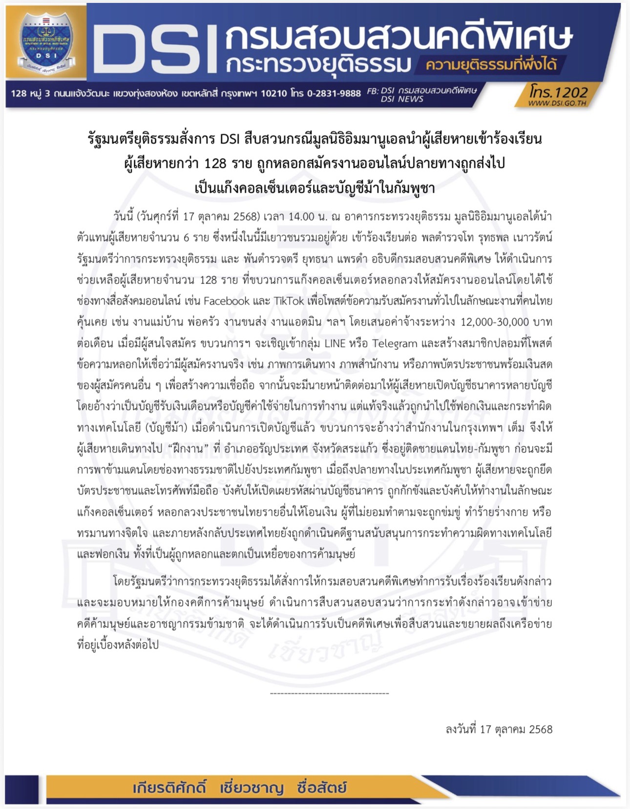 รัฐมนตรียุติธรรมสั่งการ DSI สืบสวนกรณีมูลนิธิอิมมานูเอลนำผู้เสียหายเข้าร้องเรียน ผู้เสียหายกว่า 128 ราย ถูกหลอกสมัครงานออนไลน์ปลายทางถูกส่งไปเป็นแก๊งคอลเซ็นเตอร์และบัญชีม้าในกัมพูชา