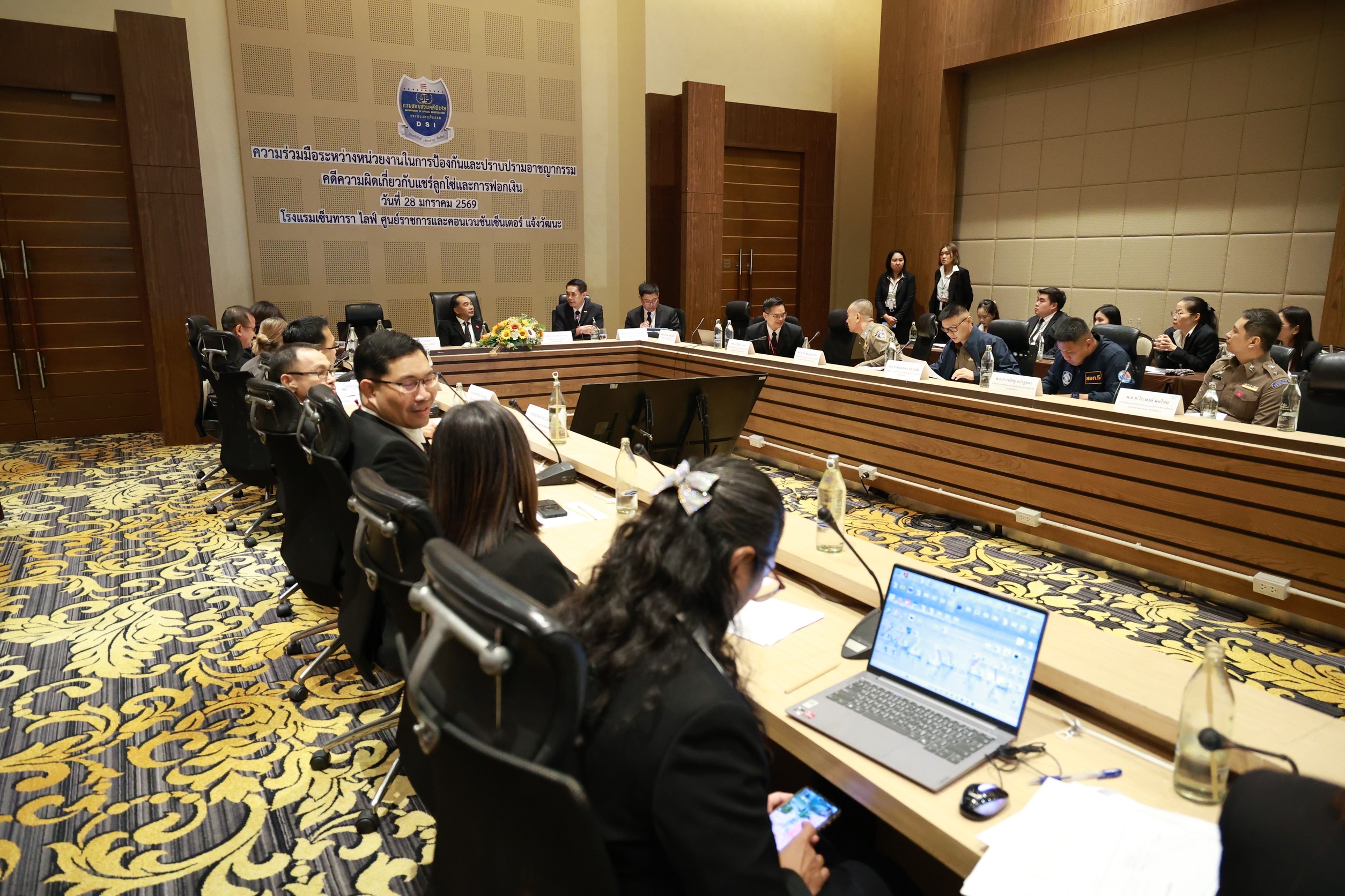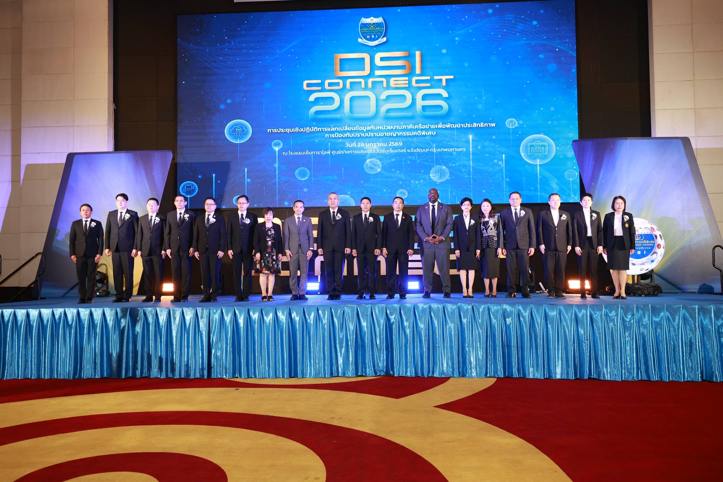 วันที่ 28 มกราคม 2569 เวลา 09.00 น. ณ โรงแรมเซ็นทารา ไลฟ์ ศูนย์ราชการและคอนเวนชันเซ็นเตอร์ แจ้งวัฒนะ พลตำรวจโท รุทธพล เนาวรัตน์ รัฐมนตรีว่าการกระทรวงยุติธรรม เป็นประธานในการประชุมเชิงปฏิบัติการแลกเปลี่ยนข้อมูลกับหน่วยงานภาคีเครือข่ายเพื่อพัฒนาประสิทธิภาพการป้องกันปราบปรามอาชญากรรมคดีพิเศษ (DSI Connect 2026) พันตำรวจตรี ยุทธนา แพรดำ อธิบดีกรมสอบสวนคดีพิเศษ ร้อยตำรวจเอกวิษณุ ฉิมตระกูล รองอธิบดีกรมสอบสวนคดีพิเศษ พันตำรวจโทอนุรักษ์ โรจนนิรันดร์กิจ รองอธิบดีกรมสอบสวนคดีพิเศษ พันตำรวจตรีจตุพล บงกชมาศ รองอธิบดีกรมสอบสวนคดีพิเศษ ร้อยตำรวจเอกสุรวุฒิ รังไสย์ รองอธิบดีกรมสอบสวนคดีพิเศษ พร้อมคณะผู้บริหาร และเจ้าหน้าที่กรมสอบสวนคดีพิเศษให้การต้อนรับ