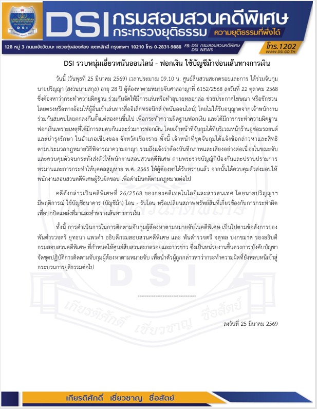 วันพุธที่ 25 มีนาคม 2569 เวลาประมาณ 09.10 น. ศูนย์สืบสวนสะกดรอยและการ ได้ร่วมจับกุม นายปริญญา (สงวนนามสกุล) อายุ 28 ปี ผู้ต้องหาตามหมายจับศาลอาญาที่ 6152/2568 ลงวันที่ 22 ตุลาคม 2568 ซึ่งต้องหาว่ากระทำความผิดฐาน ร่วมกันจัดให้มีการเล่นหรือทำอุบายหลอกล่อ ช่วยประกาศโฆษณา หรือชักชวนโดยตรงหรือทางอ้อมให้ผู้อื่นเข้าเล่นทางสื่ออิเล็กทรอนิกส์ (พนันออนไลน์) โดยไม่ได้รับอนุญาตจากเจ้าพนักงาน ร่วมกันสมคบโดยตกลงกันตั้งแต่สองคนขึ้นไป เพื่อกระทำความผิดฐานฟอกเงิน และได้มีการกระทำความผิดฐานฟอกเงินเพราะเหตุที่ได้มีการสมคบกันและร่วมการฟอกเงิน โดยเจ้าหน้าที่จับกุมได้ที่บริเวณหน้าร้านอู่ซ่อมรถยนต์และบำรุงรักษา ในอำเภอเชียงของ จังหวัดเชียงราย ทั้งนี้ เจ้าหน้าที่ชุดจับกุมได้แจ้งข้อกล่าวหาและสิทธิตามประมวลกฎหมายวิธีพิจารณาความอาญา รวมถึงแจ้งว่าต้องบันทึกภาพและเสียงอย่างต่อเนื่องในขณะจับและควบคุมตัวจนกระทั่งส่งตัวให้พนักงานสอบสวนคดีพิเศษ ตามพระราชบัญญัติป้องกันและปราบปรามการทรมานและการกระทำให้บุคคลสูญหาย พ.ศ. 2565 ให้ผู้ต้องหาได้รับทราบแล้ว จากนั้นได้ควบคุมตัวส่งมอบให้พนักงานสอบสวนคดีพิเศษผู้รับผิดชอบ เพื่อดำเนินคดีตามกฎหมายต่อไป
