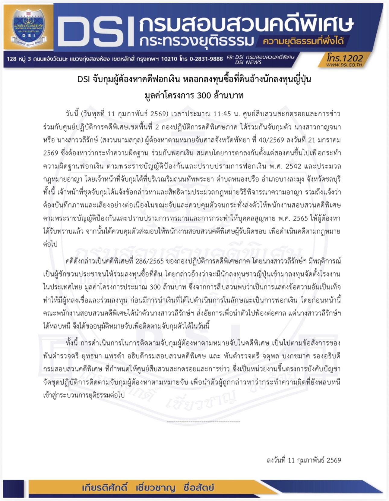 DSI จับกุมผู้ต้องหาคดีฟอกเงิน หลอกลงทุนซื้อที่ดินอ้างนักลงทุนญี่ปุ่น มูลค่าโครงการ 300 ล้านบาท
