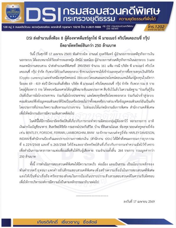 DSI ส่งสำนวนสั่งฟ้อง 8 ผู้ต้องหาคดีแชร์ลูกโซ่ พี มายเนอร์ คริปโตเคอเรนซี่ กรุ๊ป ยึดอายัดทรัพย์สินกว่า 250 ล้านบาท