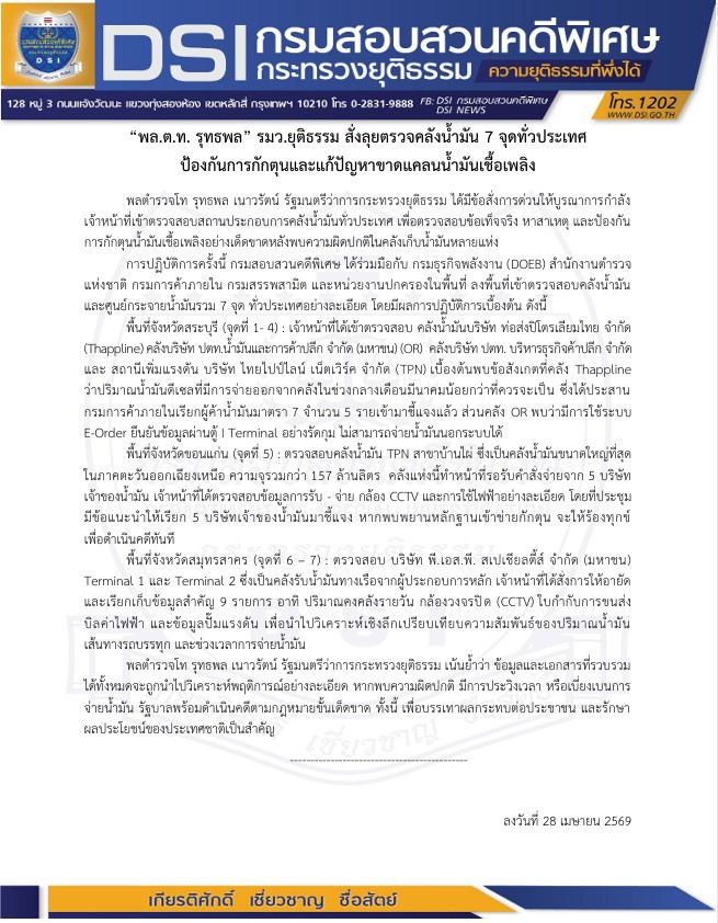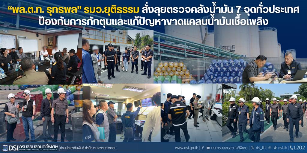 พลตำรวจโท รุทธพล เนาวรัตน์ รัฐมนตรีว่าการกระทรวงยุติธรรม ได้มีข้อสั่งการด่วนให้บูรณาการกำลังเจ้าหน้าที่เข้าตรวจสอบสถานประกอบการคลังน้ำมันทั่วประเทศ เพื่อตรวจสอบข้อเท็จจริง หาสาเหตุ และป้องกันการกักตุนน้ำมันเชื้อเพลิงอย่างเด็ดขาดหลังพบความผิดปกติในคลังเก็บน้ำมันหลายแห่ง