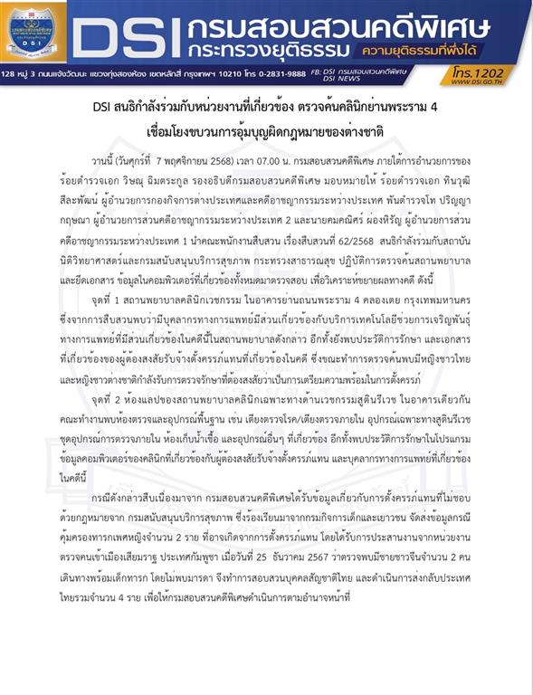 วานนี้ (วันศุกร์ที่ 7 พฤศจิกายน 2568) เวลา 07.00 น. กรมสอบสวนคดีพิเศษ ภายใต้การอำนวยการของ ร้อยตำรวจเอก วิษณุ ฉิมตระกูล รองอธิบดีกรมสอบสวนคดีพิเศษ มอบหมายให้ ร้อยตำรวจเอก ทินวุฒิ สีละพัฒน์ ผู้อำนวยการกองกิจการต่างประเทศและคดีอาชญากรรมระหว่างประเทศ พันตำรวจโท ปริญญา กฤษณา ผู้อำนวยการส่วนคดีอาชญากรรมระหว่างประเทศ 2 และนายคมคณิศร์ ผ่องหิรัญ ผู้อำนวยการส่วนคดีอาชญากรรมระหว่างประเทศ 1 นำคณะพนักงานสืบสวน เรื่องสืบสวนที่ 62/2568 สนธิกำลังร่วมกับสถาบันนิติวิทยาศาสตร์และกรมสนับสนุนบริการสุขภาพ กระทรวงสาธารณสุข ปฏิบัติการตรวจค้นสถานพยาบาลและยึดเอกสาร ข้อมูลในคอมพิวเตอร์ที่เกี่ยวข้องทั้งหมดมาตรวจสอบ เพื่อวิเคราะห์ขยายผลทางคดี ดังนี้