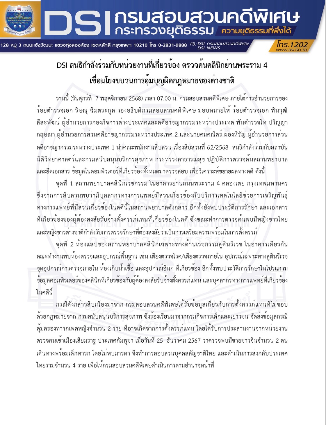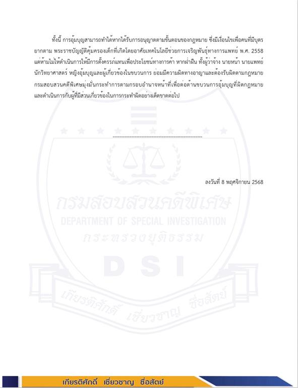 DSI สนธิกำลังร่วมกับหน่วยงานที่เกี่ยวข้อง ตรวจค้นคลินิกย่านพระราม 4 เชื่อมโยงขบวนการอุ้มบุญผิดกฎหมายของต่างชาติ