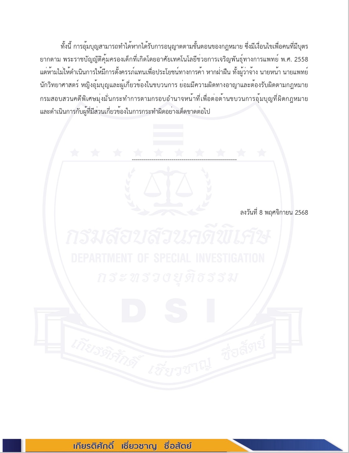 ทั้งนี้ การอุ้มบุญสามารถทำได้หากได้รับการอนุญาตตามขั้นตอนของกฎหมาย ซึ่งมีเงื่อนไขเพื่อคนที่มีบุตรยากตาม พระราชบัญญัติคุ้มครองเด็กที่เกิดโดยอาศัยเทคโนโลยีช่วยการเจริญพันธุ์ทางการแพทย์ พ.ศ. 2558 แต่ห้ามไม่ให้ดำเนินการให้มีการตั้งครรภ์แทนเพื่อประโยชน์ทางการค้า หากฝ่าฝืน ทั้งผู้ว่าจ้าง นายหน้า นายแพทย์ นักวิทยาศาสตร์ หญิงอุ้มบุญและผู้เกี่ยวข้องในขบวนการ ย่อมมีความผิดทางอาญาและต้องรับผิดตามกฎหมาย กรมสอบสวนคดีพิเศษมุ่งมั่นกระทำการตามกรอบอำนาจหน้าที่เพื่อต่อต้านขบวนการอุ้มบุญที่ผิดกฎหมาย และดำเนินการกับผู้ที่มีส่วนเกี่ยวข้องในการกระทำผิดอย่างเด็ดขาดต่อไป