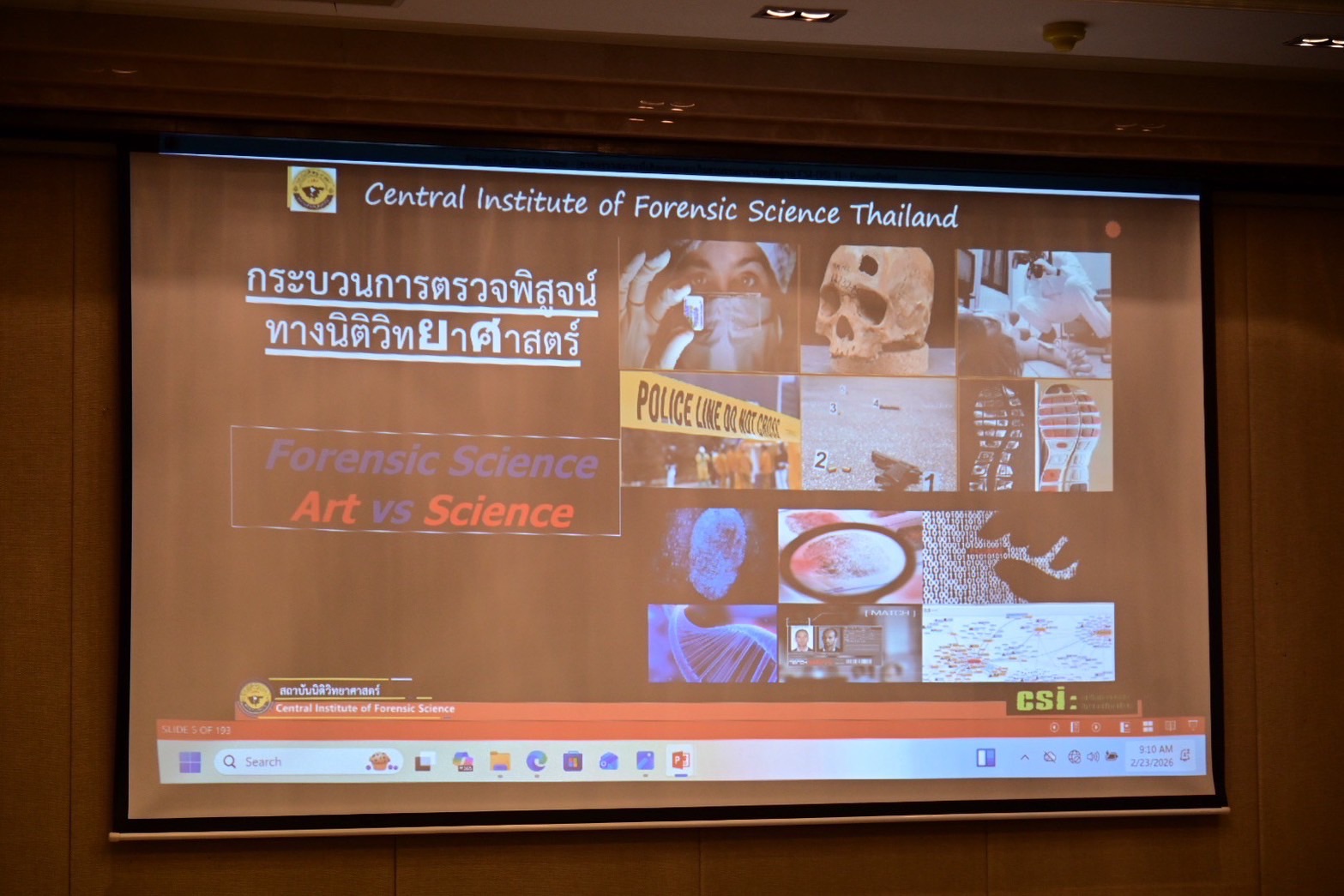 ในการนี้ นางสาวญาณินี ปรีชาวิทย์ ผู้อำนวยการส่วนพัฒนาความเชี่ยวชาญพิเศษ ได้กล่าวรายงานถึงวัตถุประสงค์ของโครงการว่า การนำองค์ความรู้และเทคโนโลยีทางนิติวิทยาศาสตร์มาประยุกต์ใช้ในการสืบสวนสอบสวน เป็นกลไกสำคัญในการเสริมสร้างความถูกต้อง แม่นยำ โปร่งใส และยกระดับมาตรฐานกระบวนการยุติธรรม