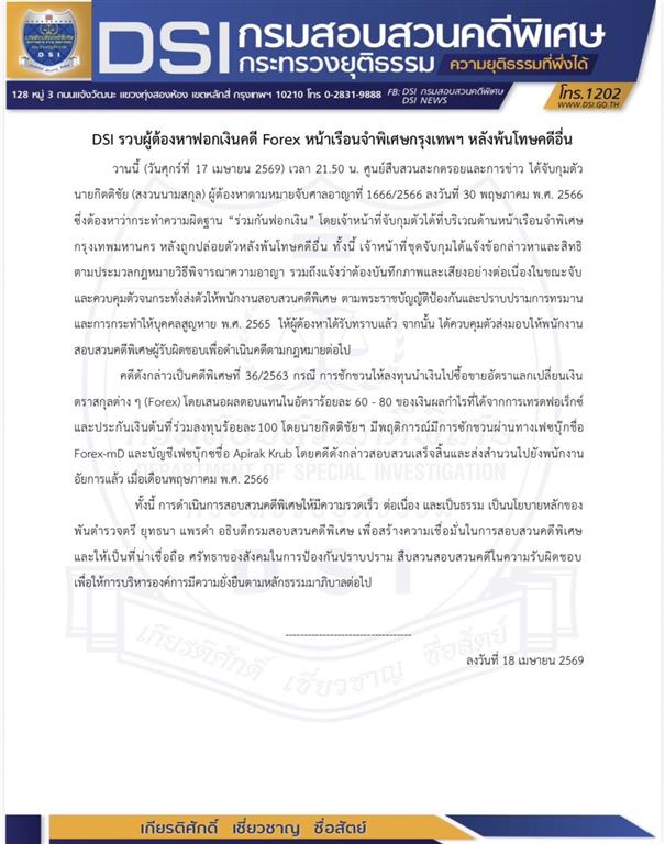 DSI รวบผู้ต้องหาฟอกเงินคดี Forex หน้าเรือนจำพิเศษกรุงเทพฯ หลังพ้นโทษคดีอื่น