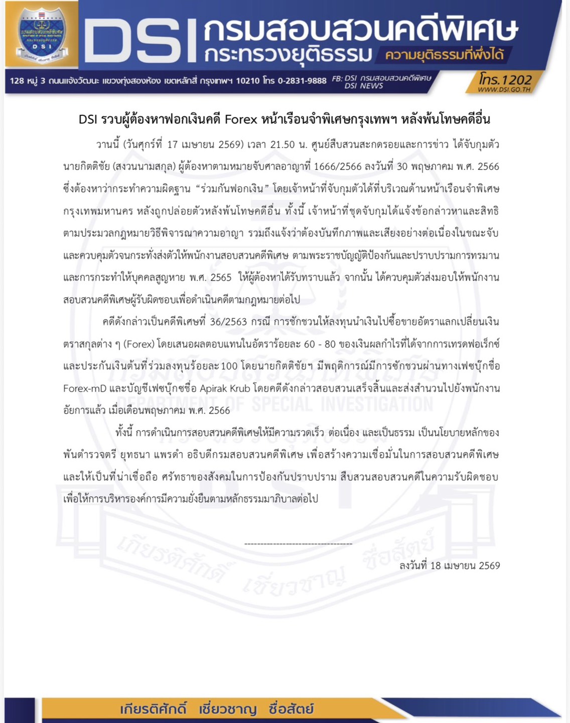 วานนี้ (วันศุกร์ที่ 17 เมษายน 2569) เวลา 21.50 น. ศูนย์สืบสวนสะกดรอยและการข่าว ได้จับกุมตัว นายกิตติชัย (สงวนนามสกุล) ผู้ต้องหาตามหมายจับศาลอาญาที่ 1666/2566 ลงวันที่ 30 พฤษภาคม พ.ศ. 2566 ซึ่งต้องหาว่ากระทำความผิดฐาน “ร่วมกันฟอกเงิน” โดยเจ้าหน้าที่จับกุมตัวได้ที่บริเวณด้านหน้าเรือนจำพิเศษกรุงเทพมหานคร หลังถูกปล่อยตัวหลังพ้นโทษคดีอื่น ทั้งนี้ เจ้าหน้าที่ชุดจับกุมได้แจ้งข้อกล่าวหาและสิทธิตามประมวลกฎหมายวิธีพิจารณาความอาญา รวมถึงแจ้งว่าต้องบันทึกภาพและเสียงอย่างต่อเนื่องในขณะจับและควบคุมตัวจนกระทั่งส่งตัวให้พนักงานสอบสวนคดีพิเศษ ตามพระราชบัญญัติป้องกันและปราบปรามการทรมานและการกระทำให้บุคคลสูญหาย พ.ศ. 2565 ให้ผู้ต้องหาได้รับทราบแล้ว จากนั้น ได้ควบคุมตัวส่งมอบให้พนักงานสอบสวนคดีพิเศษผู้รับผิดชอบ เพื่อดำเนินคดีตามกฎหมายต่อไป