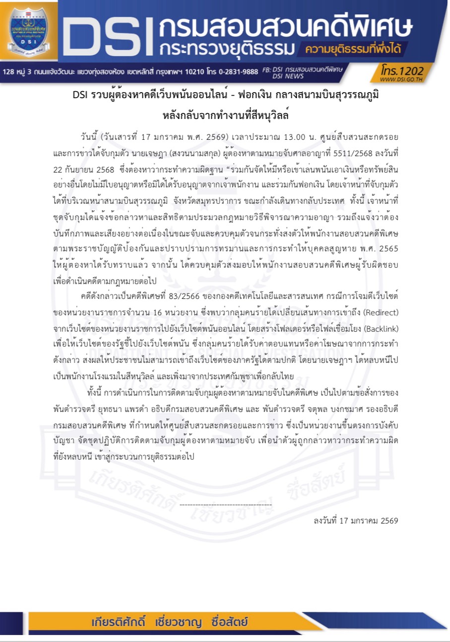 เผยแพร่: 19 ม.ค. 2569 9:31 น. ปรับปรุง: 19 ม.ค. 2569 9:53 น. เปิดอ่าน 59 ครั้งDSI รวบผู้ต้องหาคดีเว็บพนันออนไลน์ - ฟอกเงิน กลางสนามบินสุวรรณภูมิ หลังกลับจากทำงานที่สีหนุวิลล์
