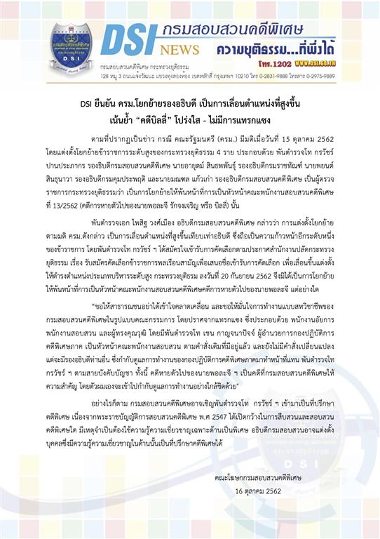 DSI ยืนยัน ครม.โยกย้ายรองอธิบดี เป็นการเลื่อนตำแหน่งที่สูงขึ้นเน้นย้ำ “คดีบิลลี่” โปร่งใส - ไม่มีการแทรกแซง