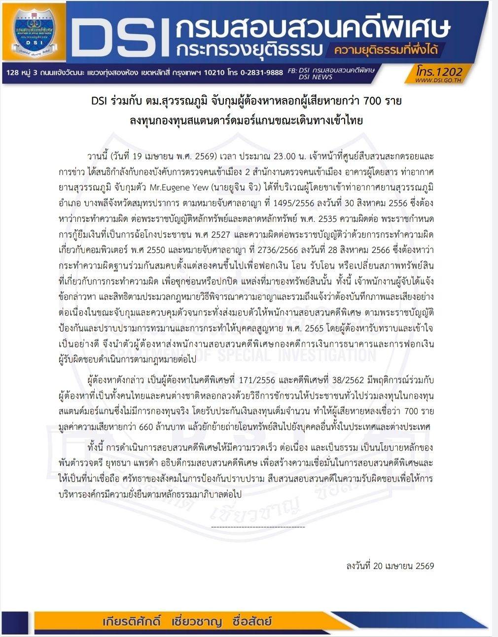 วานนี้ (วันที่ 19 เมษายน พ.ศ. 2569) เวลา ประมาณ 23.00 น. เจ้าหน้าที่ศูนย์สืบสวนสะกดรอยและ การข่าว ได้สนธิกำลังกับกองบังคับการตรวจคนเข้าเมือง 2 สำนักงานตรวจคนเข้าเมือง อาคารผู้โดยสาร ท่าอากาศยานสุวรรณภูมิ จับกุมตัว Mr.Eugene Yew (นายยูจิน จิว) ได้ที่บริเวณผู้โดยขาเข้าท่าอากาศยานสุวรรณภูมิ อำเภอ บางพลีจังหวัดสมุทรปราการ ตามหมายจับศาลอาญา ที่ 1495/2556 ลงวันที่ 30 สิงหาคม 2556 ซึ่งต้องหาว่ากระทำความผิด ต่อพระราชบัญญัติหลักทรัพย์และตลาดหลักทรัพย์ พ.ศ. 2535 ความผิดต่อ พระราชกำหนด การกู้ยืมเงินที่เป็นการฉ้อโกงประชาชน พ.ศ 2527 และความผิดต่อพระราชบัญญัติว่าด้วยการกระทำความผิดเกี่ยวกับคอมพิวเตอร์ พ.ศ 2550 และหมายจับศาลอาญา ที่ 2736/2566 ลงวันที่ 28 สิงหาคม 2566 ซึ่งต้องหาว่า กระทำความผิดฐานร่วมกันสมคบตั้งแต่สองคนขึ้นไปเพื่อฟอกเงิน โอน รับโอน หรือเปลี่ยนสภาพทรัพย์สินที่เกี่ยวกับการกระทำความผิด เพื่อซุกซ่อนหรือปกปิด แหล่งที่มาของทรัพย์สินนั้น ทั้งนี้ เจ้าพนักงานผู้จับได้แจ้ง ข้อกล่าวหา และสิทธิตามประมวลกฎหมายวิธีพิจารณาความอาญาและรวมถึงแจ้งว่าต้องบันทึกภาพและเสียงอย่างต่อเนื่องในขณะจับกุมและควบคุมตัวจนกระทั่งส่งมอบตัวให้พนักงานสอบสวนคดีพิเศษ ตามพระราชบัญญัติป้องกันและปราบปรามการทรมานและการกระทำให้บุคคลสูญหาย พ.ศ. 2565 โดยผู้ต้องหารับทราบและเข้าใจเป็นอย่างดี จึงนำตัวผู้ต้องหาส่งพนักงานสอบสวนคดีพิเศษกองคดีการเงินการธนาคารและการฟอกเงิน ผู้รับผิดชอบดำเนินการตามกฎหมายต่อไป